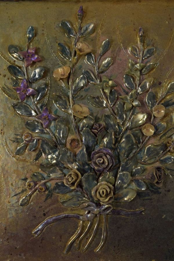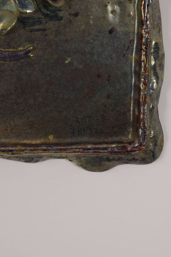 Pannello in ceramica a lustro policroma, cornice modanata e fiori a rilievo e applicati.