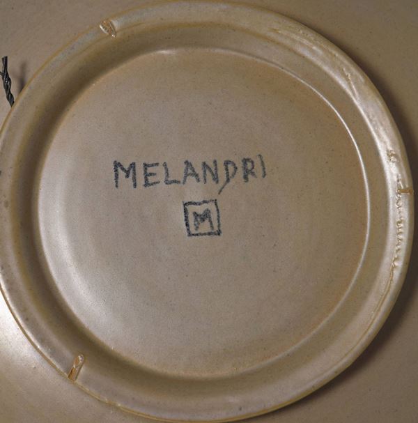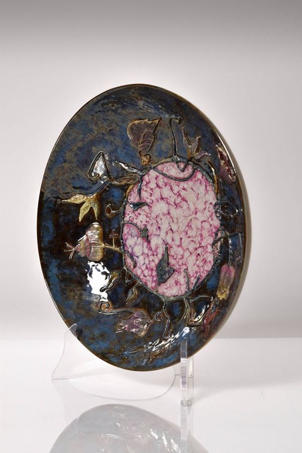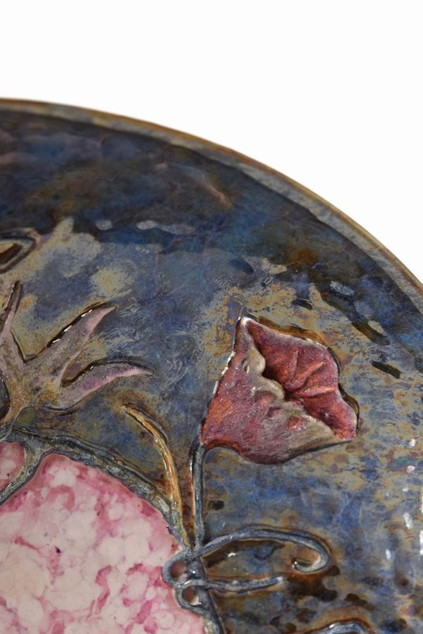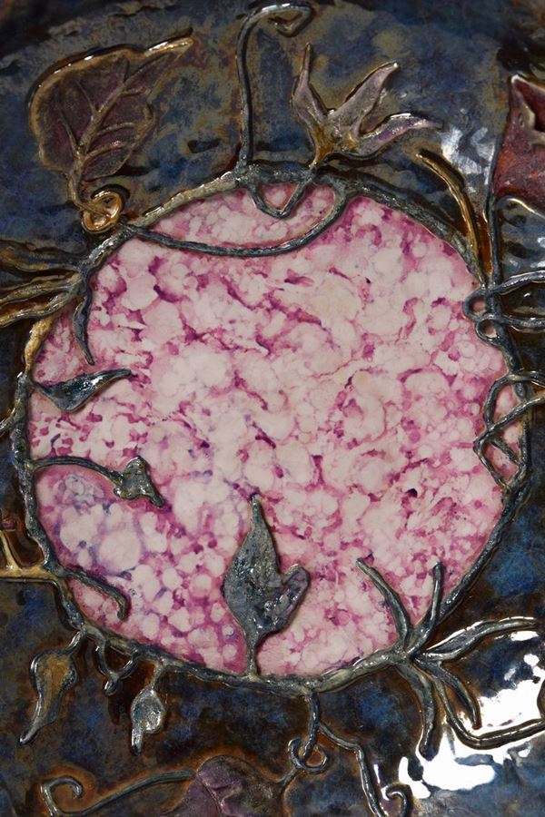 Ciotola in ceramica policroma con tondo ad effetto marmo rosa al centro, circondato da una ghirlanda di fiori a bassorilievo, fondo sfumato nei colori del blu.