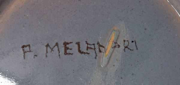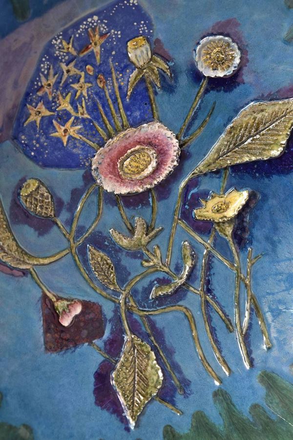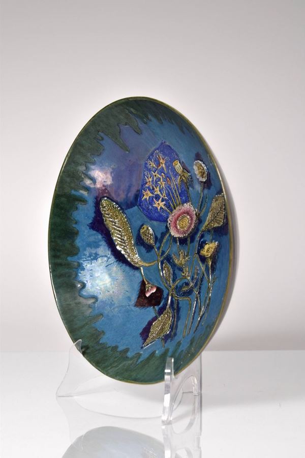 Ciotola in ceramica policroma riflessata all'acido con fiori a rilievo stilizzati a fondo azzurro al centro, bordo a colore sfumato verde.