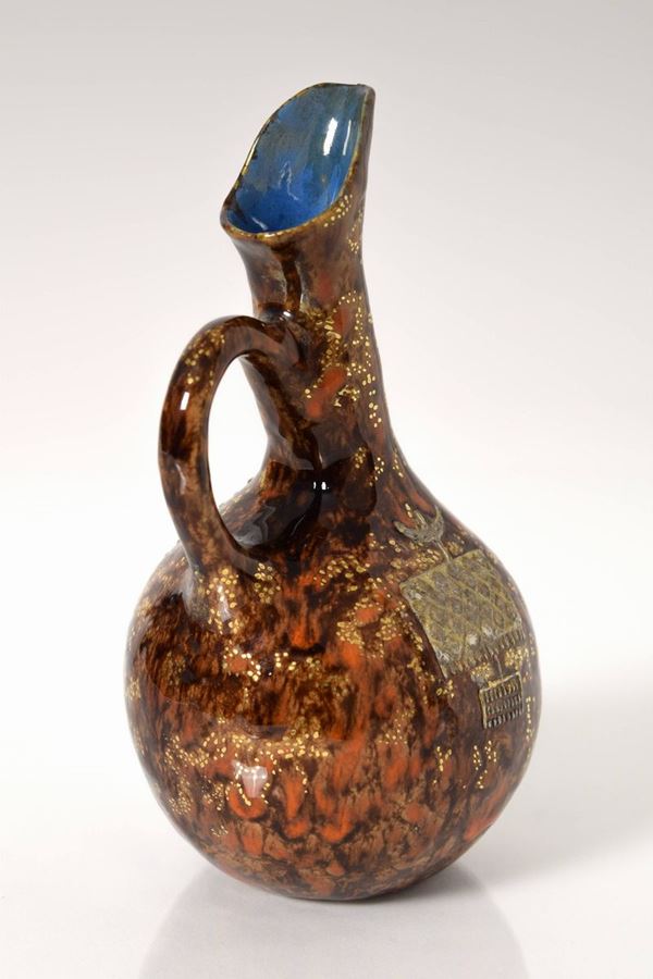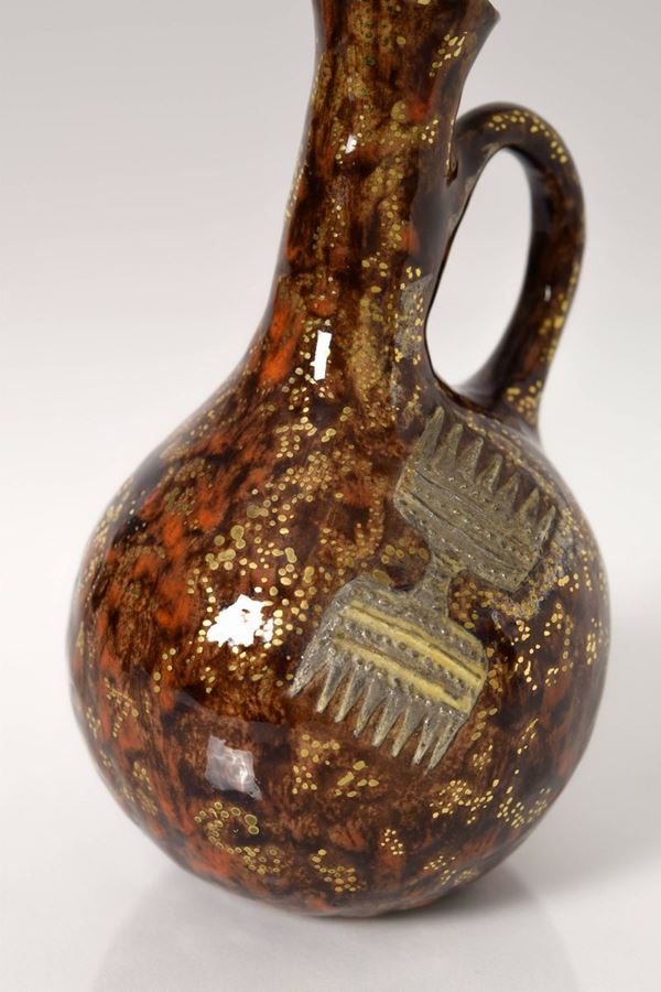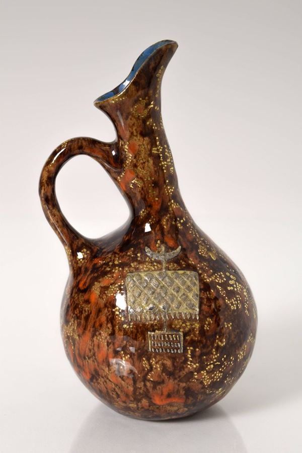 Vasetto in ceramica policroma e riflessata con manico. Fondo a colorature nei colori del bruno e rosso con rifiniture in oro, interno della bocca di colore azzurro. In entrambi i lati a bassorilievo arnesi dell'antica Grecia in color platino.