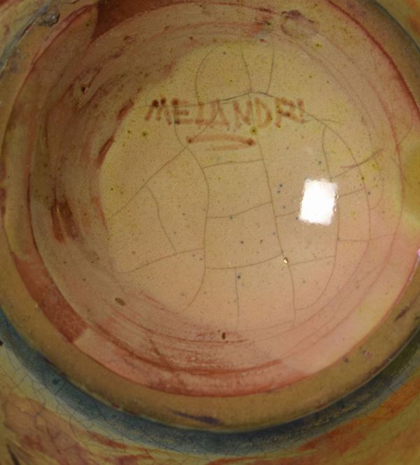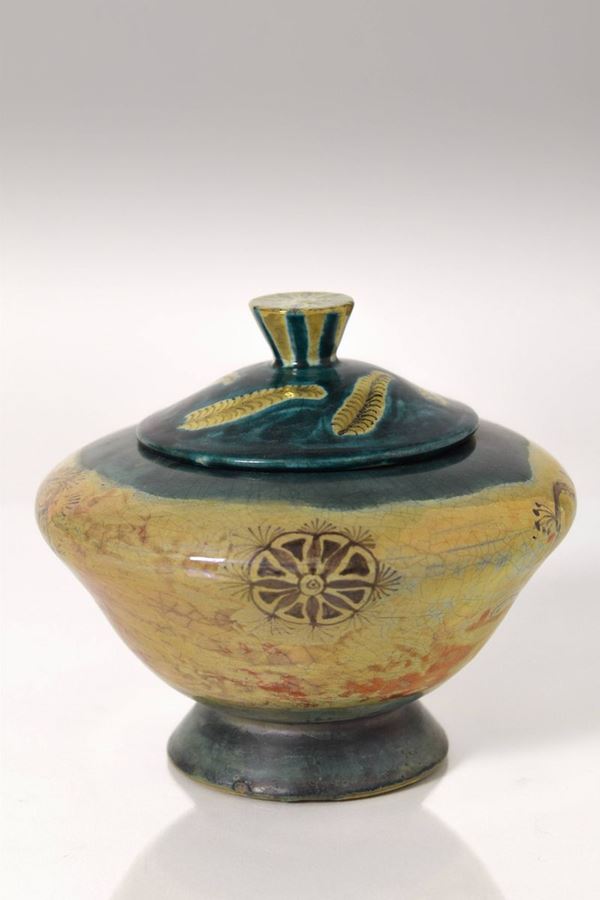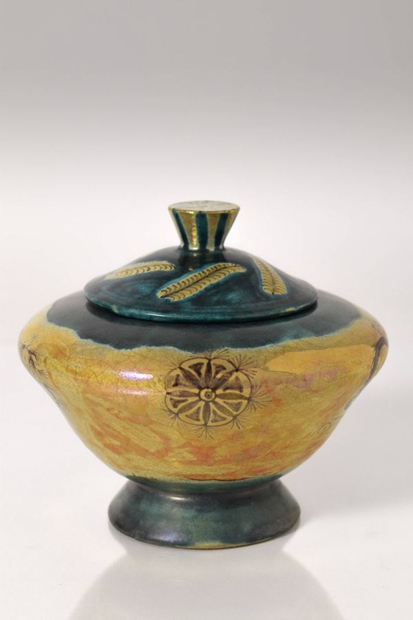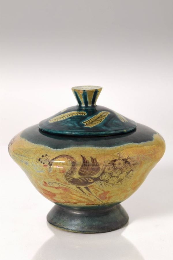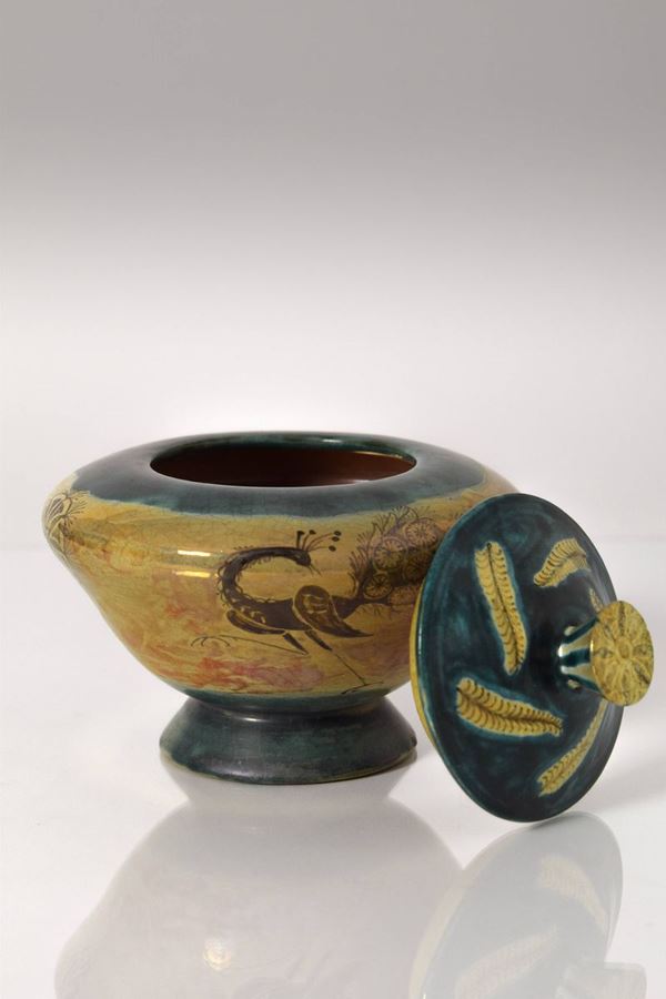 Vasetto con coperchio in ceramica policroma rifinita all'acido, dipinta con pavoni e motivi floreali. Coperchio dipinto a penne di pavone color oro, a fondo verde, interno dorato e riflessato.