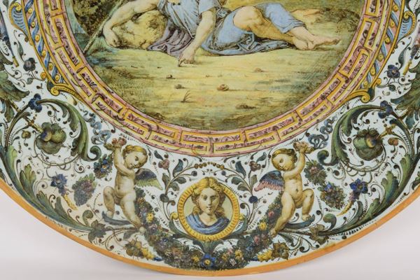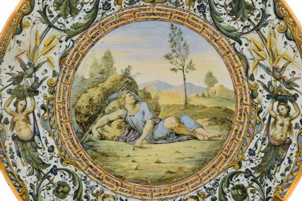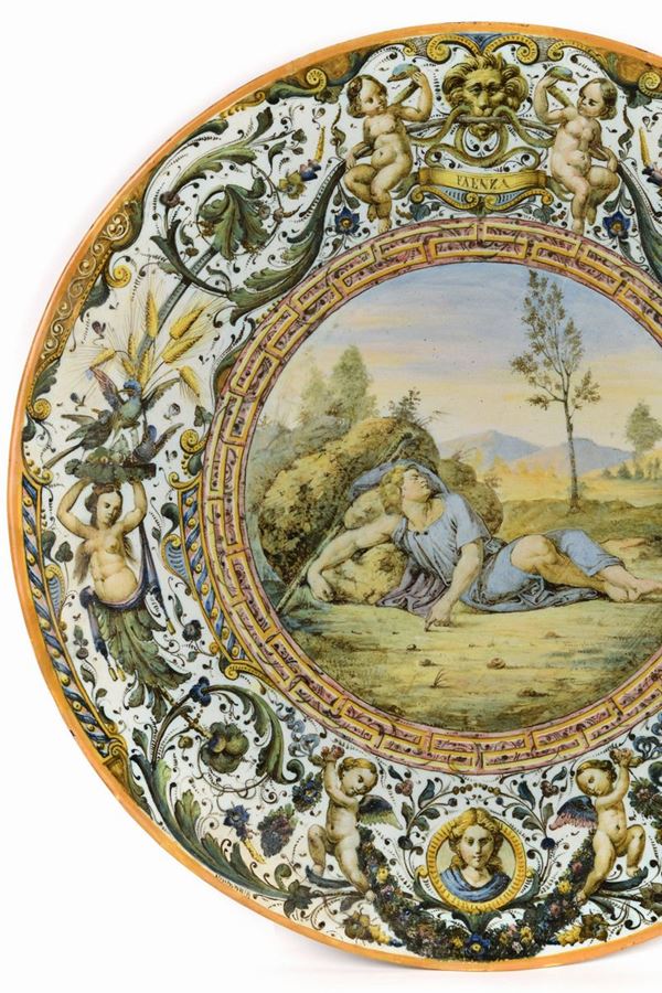 Grande piatto da parata in maiolica policroma finemente dipinto con scena mitologica "Il sonno di Rinaldo" al centro, incorniciata da una greca romana e da una tesa magistralmente dipinta con putti, figure allegoriche, mascheroni ghirlande e altri motivi vegetali e floreali. Nella parte centrale in alto è presente un cartiglio con la scritta "FAENZA" sorretto da due putti.