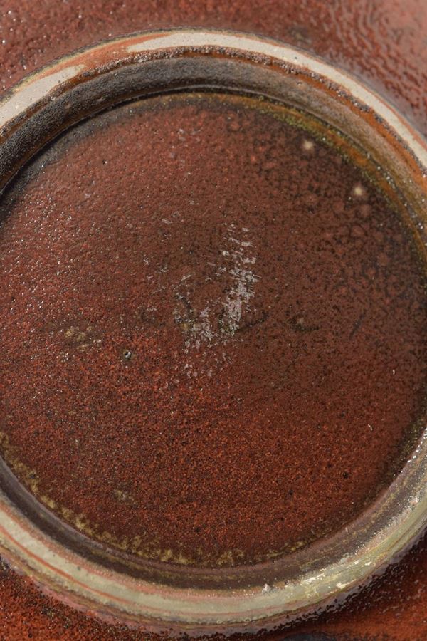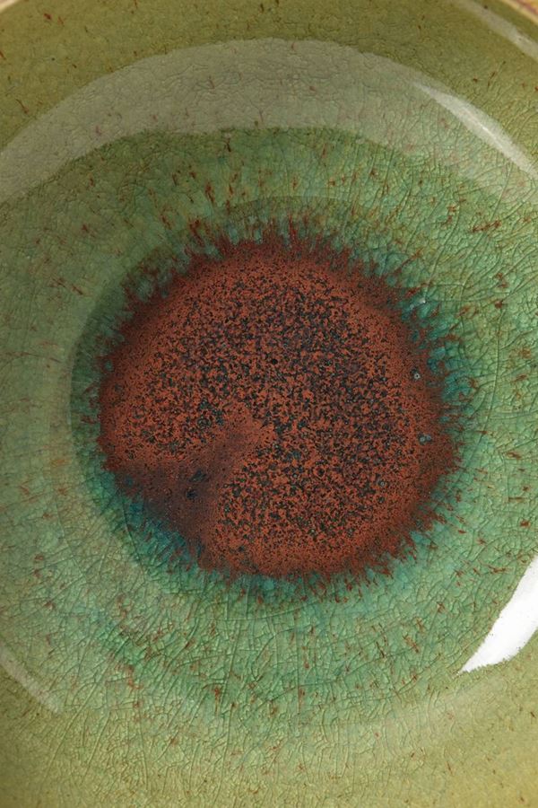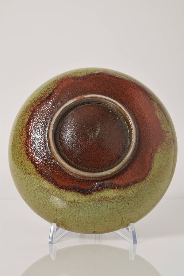 Ciotola a bordo alto in ceramica policroma con spessa invetriatura, all'interno sul fondo grande macchia di colore rosso mattone, circondata da sfumature nelle tonalità del verde.