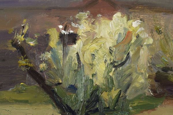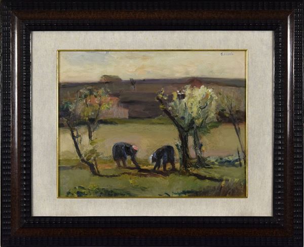 Olio su legno raffigurante paesaggio rurale con due donne al lavoro e case in campagna in lontananza. Cornice degli anni '30 in legno trottata nera e radica.