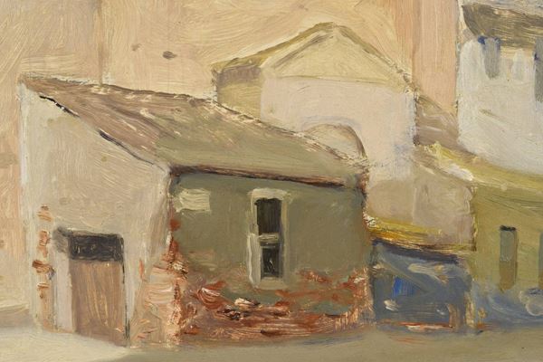 Olio su legno con in primo piano facciata e fiancata della Chiesa di San Sebastiano di Forlì. Cornice in noce massello.
