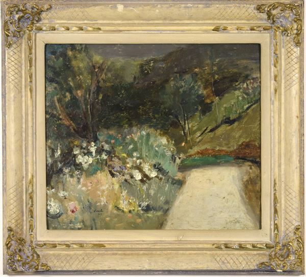 Olio su legno raffigurante paesaggio di campagna. Cornice coeva laccata in avorio e oro antico.