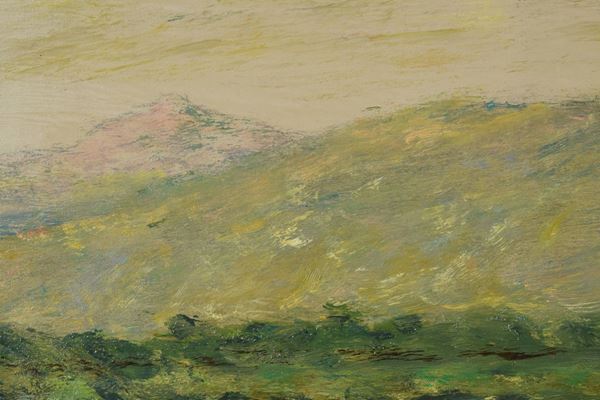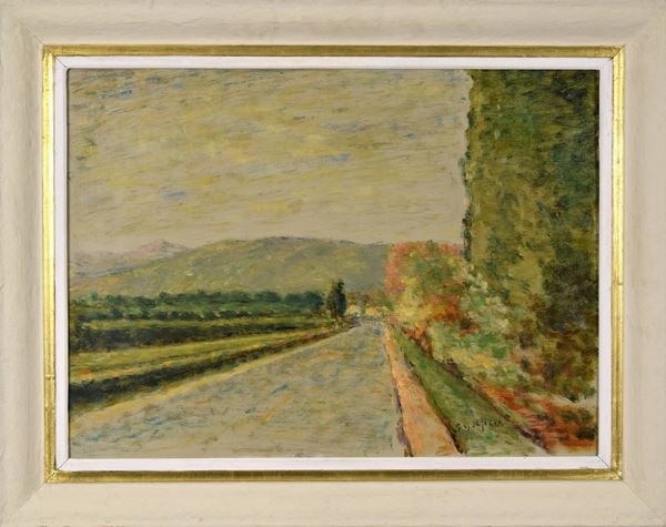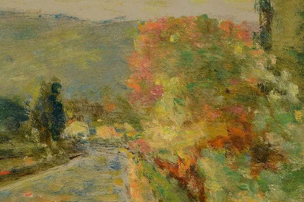 Olio su legno di paesaggio di campagna faentina. Cornice coeva dell'autore.