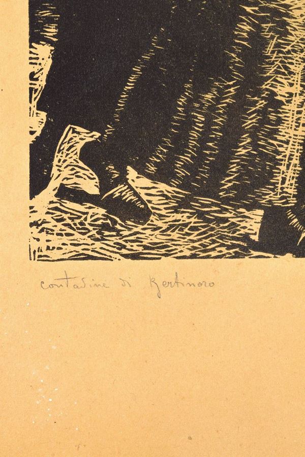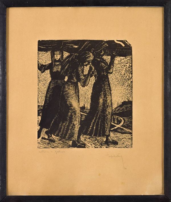 Xilografia su carta a un legno raffigurante tre contadine che portano un carico sulle spalle. Nel retro presenta etichetta di partecipazione alla prima esposizione annuale di arte contemporanea romagnola in Rimini.
