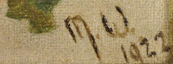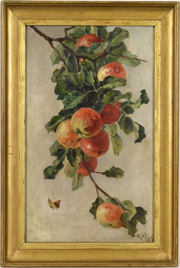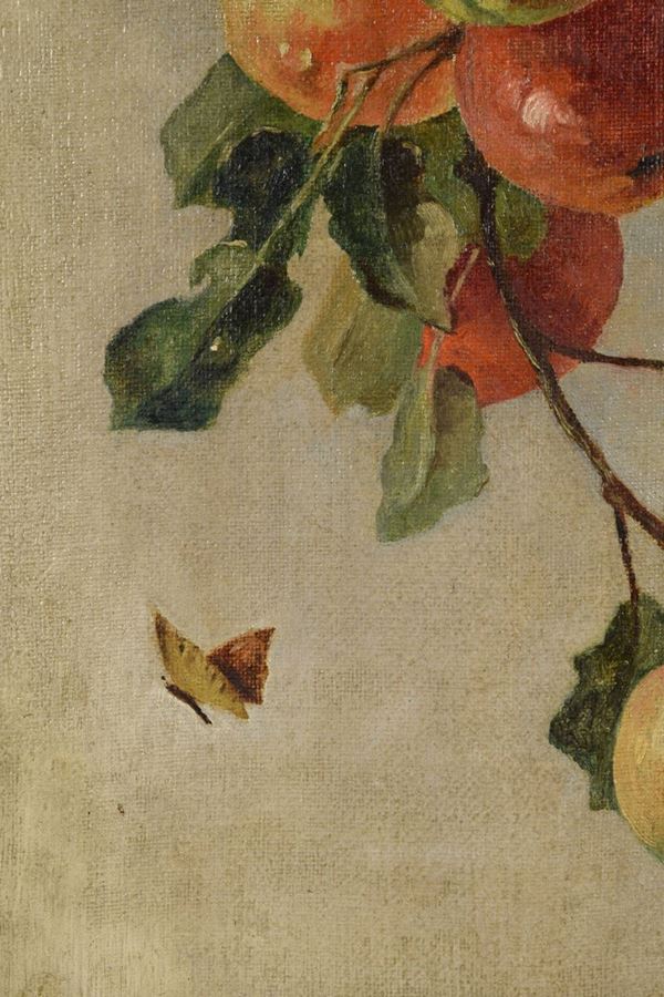 Olio su tela raffigurante ramo di pesche con piccola farfalla in basso a sinistra. Cornice coeva. Reca nel retro etichetta coeva in inglese.