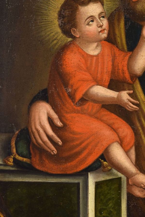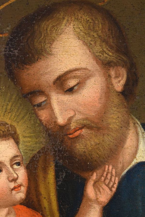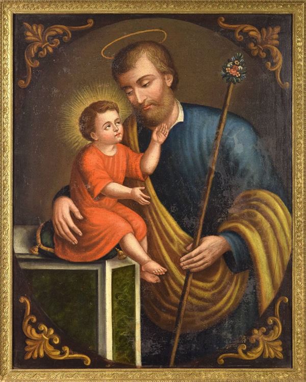 Olio su tela raffigurante San Giuseppe con Gesù Bambino seduto su di un cuscino stante su una colonna marmorizzata. Angoli decorati con fregi. Cornice dorata coeva.