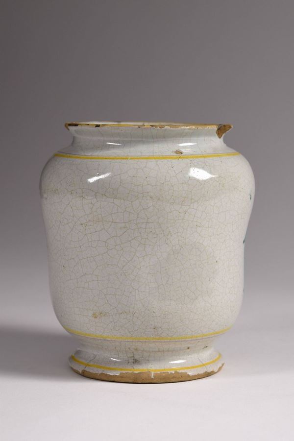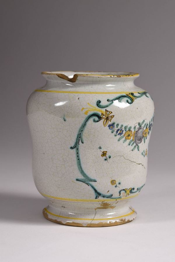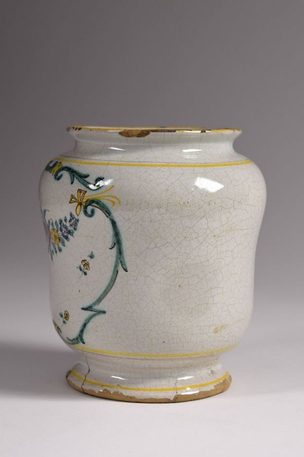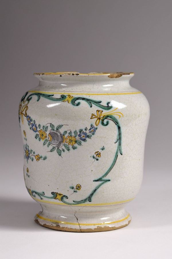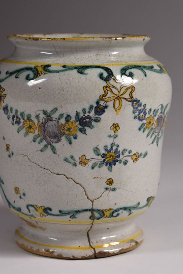 Albarello in maiolica policroma dipinta con ghirlande e nastri, nei colori del giallo, verde e blu.