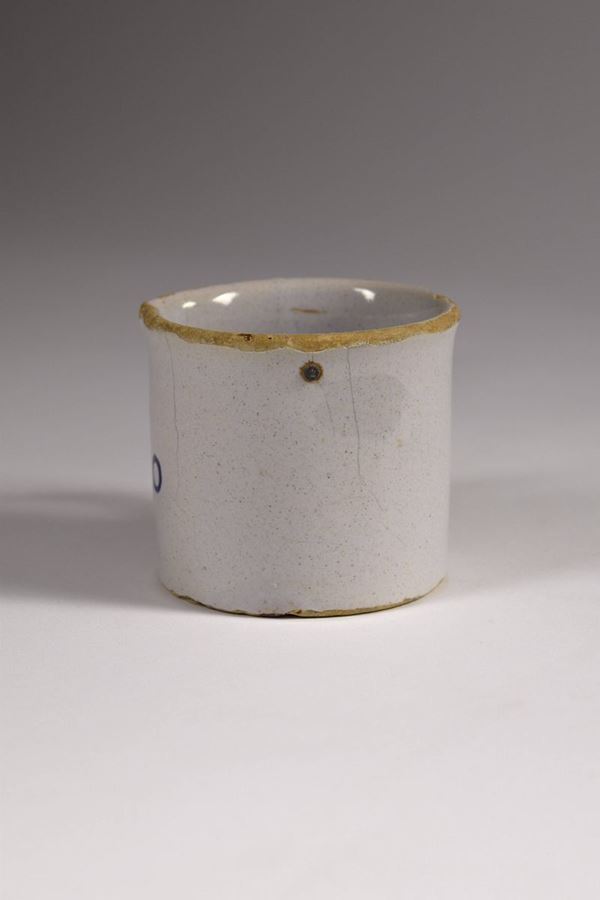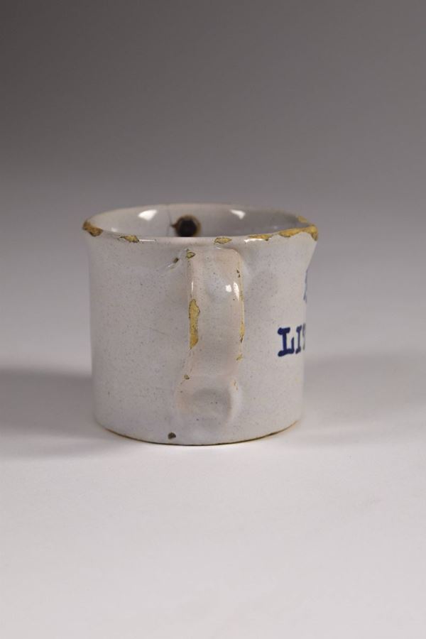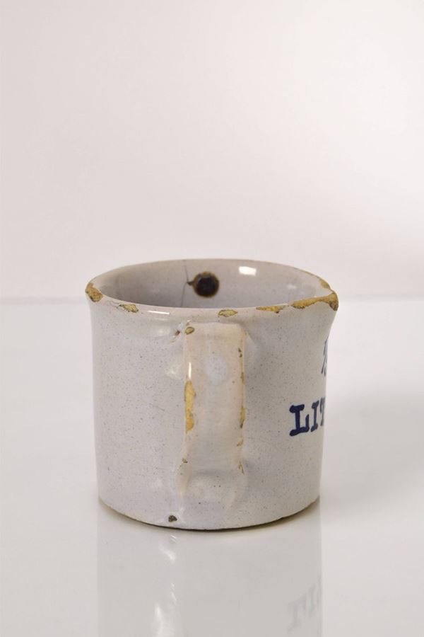 Bicchiere in maiolica bianca con scritta "1/5 litro" in blu, all'interno piombo annonario (bollo fiscale).