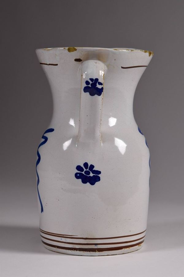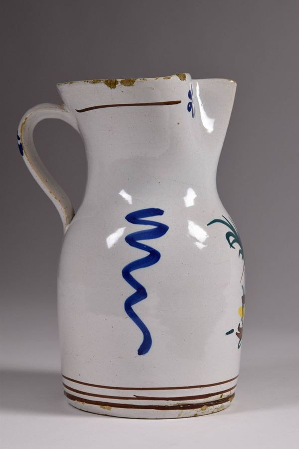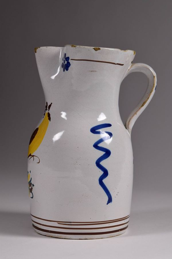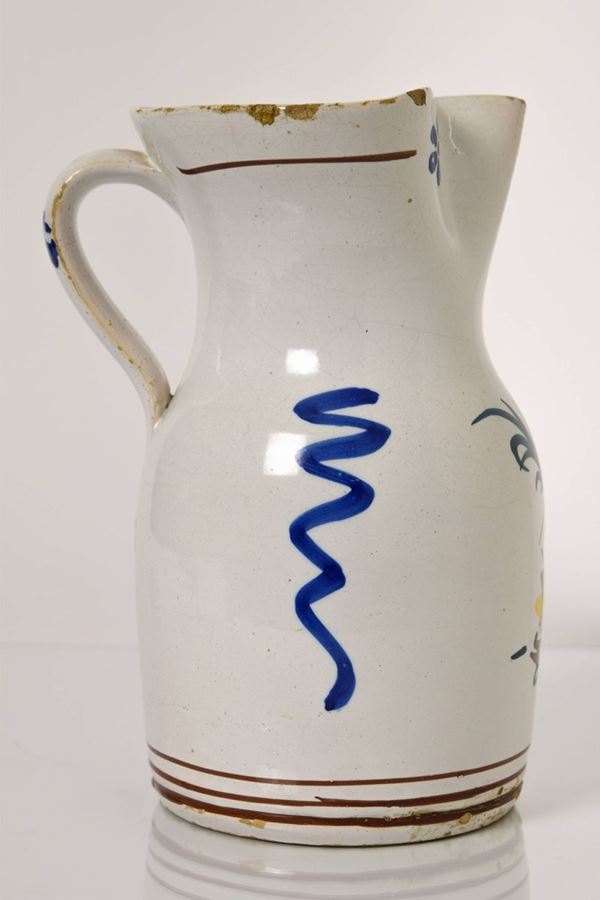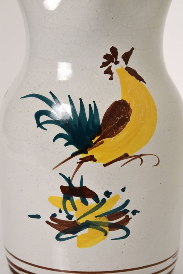 Boccale in maiolica policroma a bocca trilobata dipinto con galletto nella parte mediana nei colori del giallo, bruno e verde. Bocca evidenziata da fiori a "spugna" blu.
