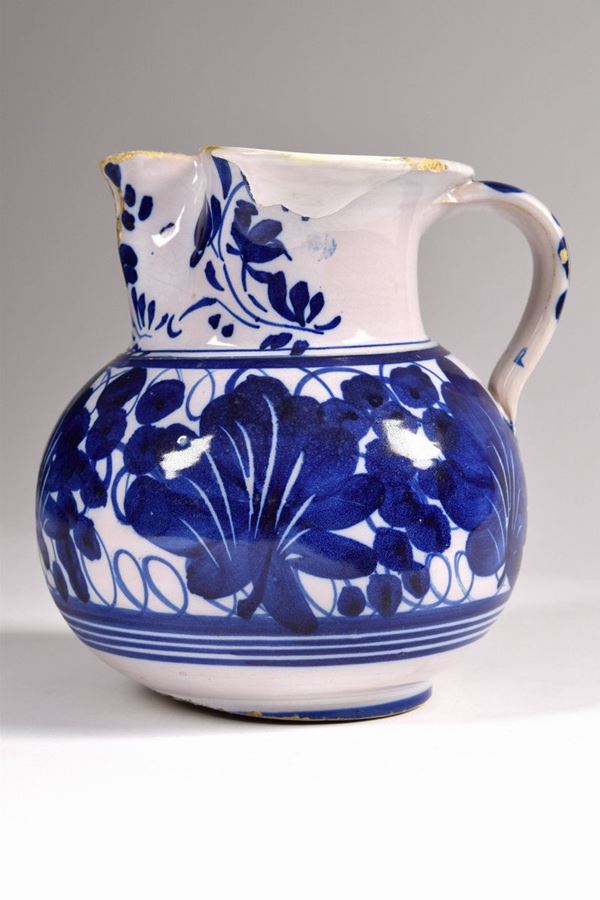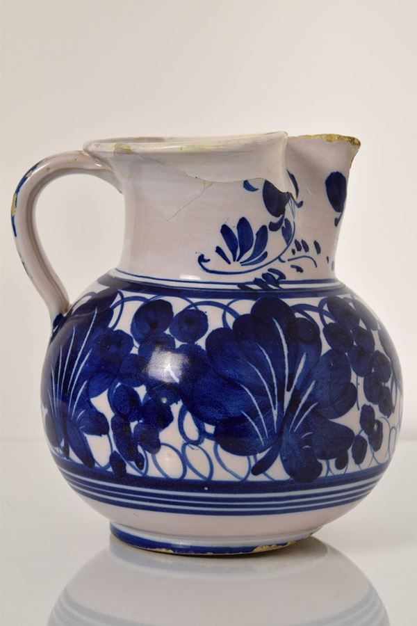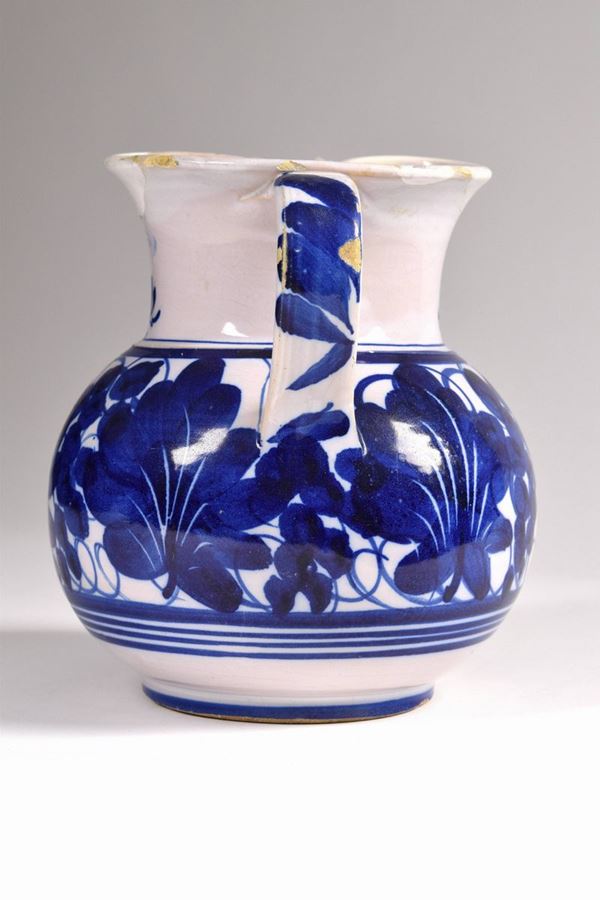 Boccale in maiolica policroma dipinto alla foglie di vite blu, bocca trilobata evidenziata da fiori.