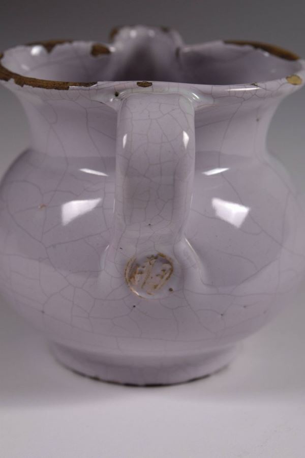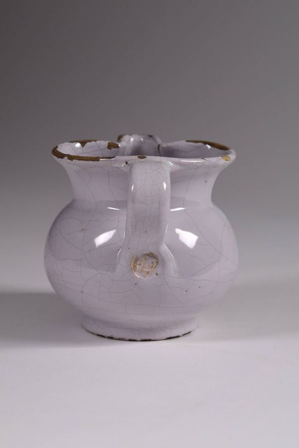 Boccale in maiolica bianca a bocca trilobata, scritta 1/2 litro in blu, senza piombino.