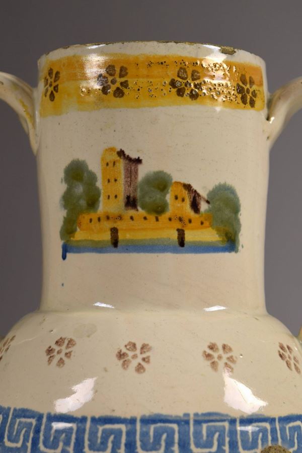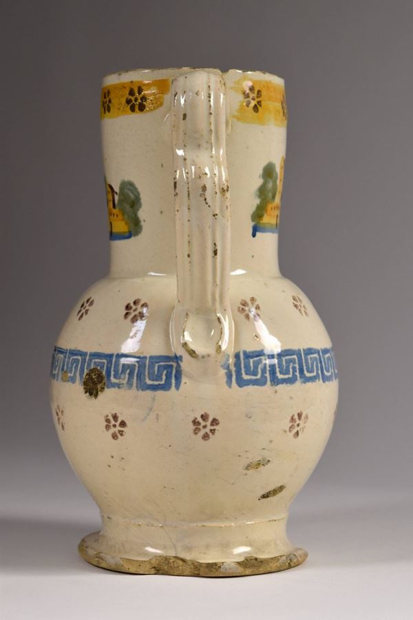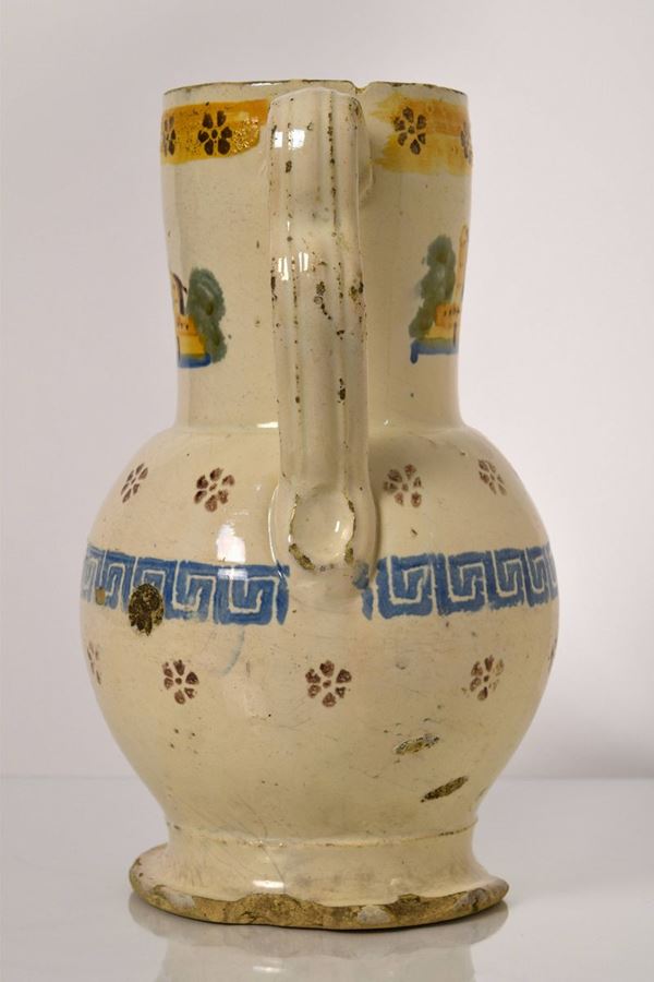 Brocca a due manici in maiolica policroma con bocca evidenziata da motivi a "spugna" in bruno a sfondo giallo ocra, nel fronte e nel retro dipinto un castello, mentre nella parte mediana è decorata a "spugna" nei colori del bruno e greca in blu.