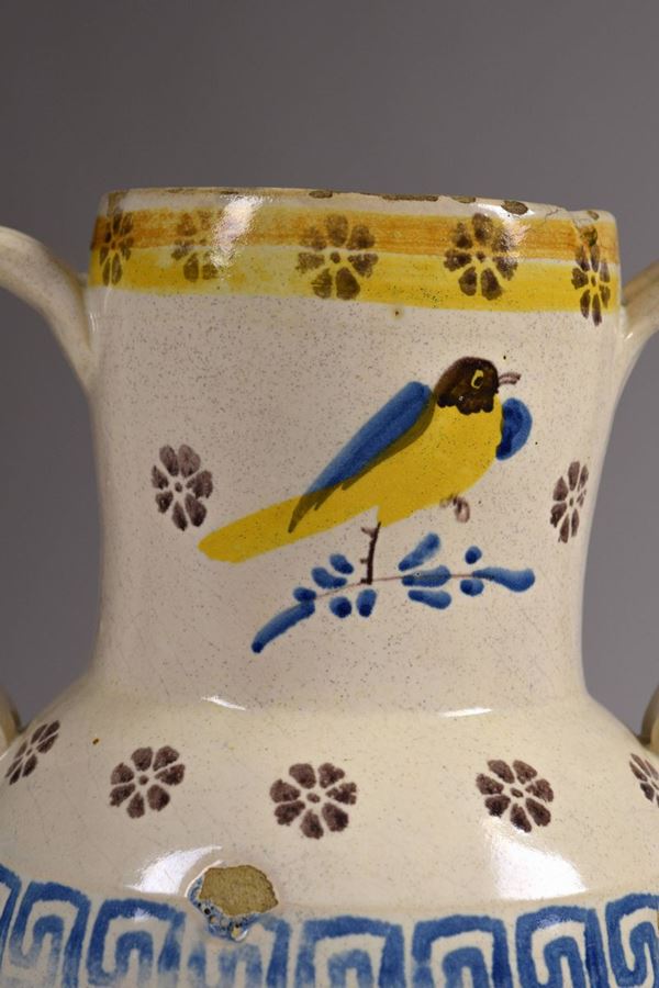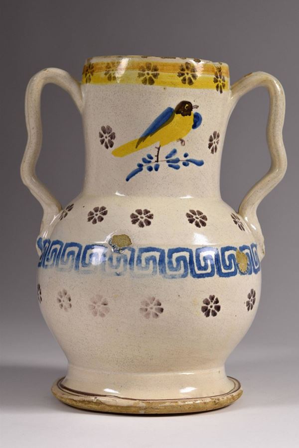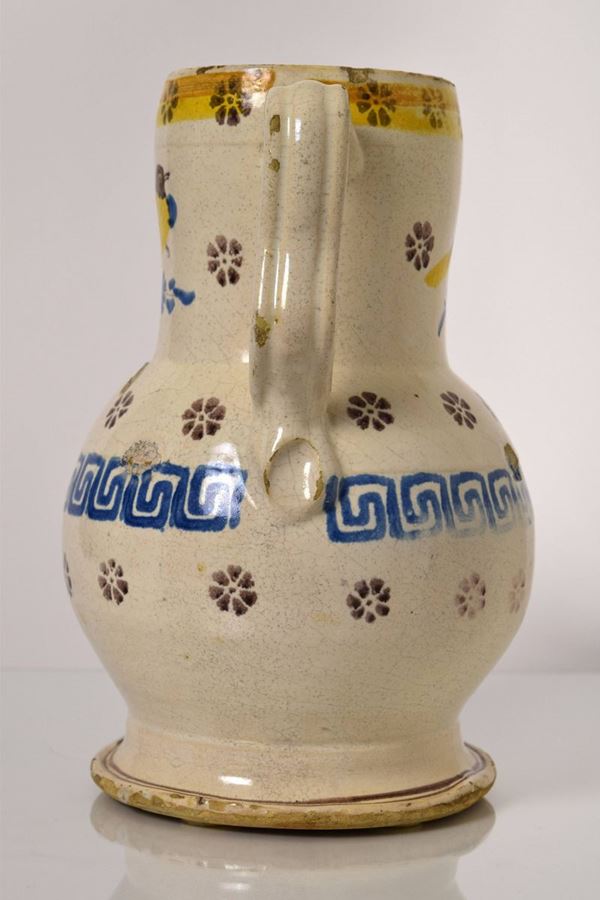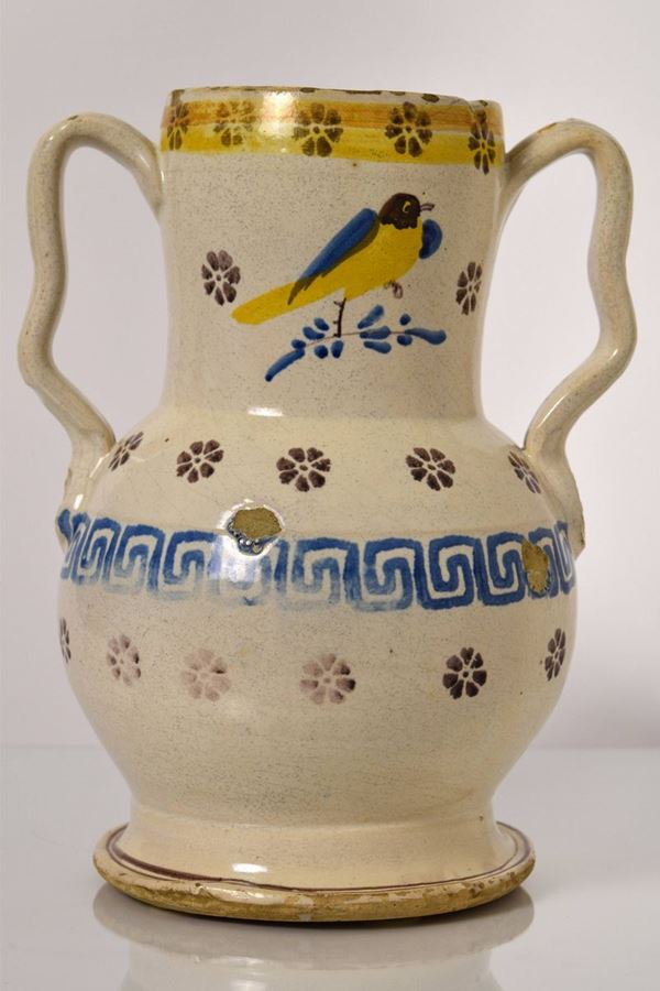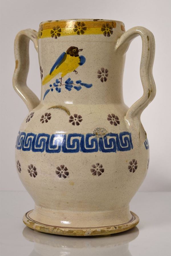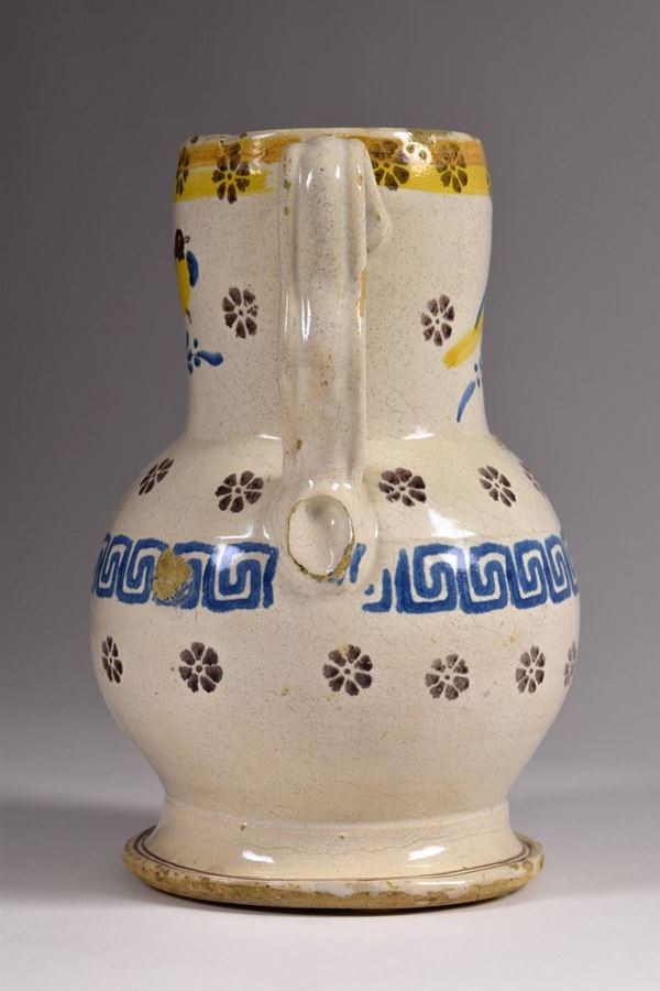 Brocca a due manici in maiolica policroma con bocca evidenziata con motivi a "spugna" in bruno a sfondo ocra, decorata nel fronte e nel retro con uccellino nei colori del giallo, azzurro e bruno. Nella pancia motivi a "spugna" in bruno e greca blu.