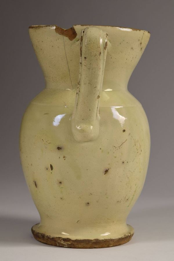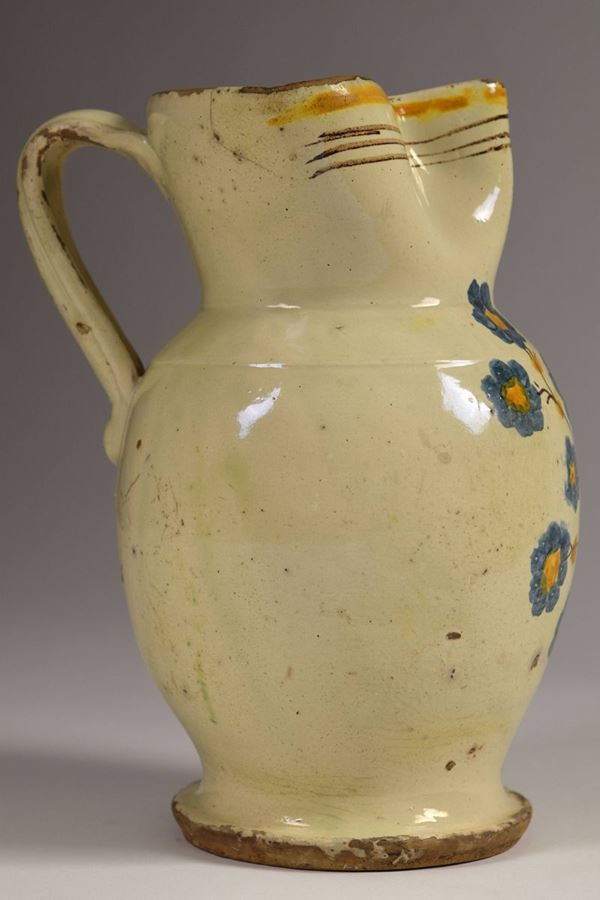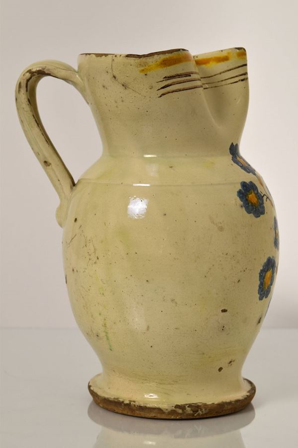 Brocca in maiolica policroma a bocca trilobata evidenziata da righe in bruno e giallo ocra, nella parte mediana è dipinto un ramo fiorito nei colori del bruno, blu e giallo ocra.
