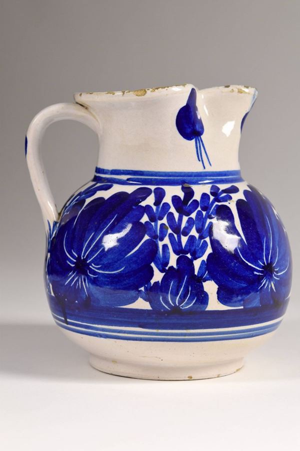 Brocca in maiolica policroma dipinta a bocca trilobata evidenziata da fiori, corpo decorato da motivi floreali blu.