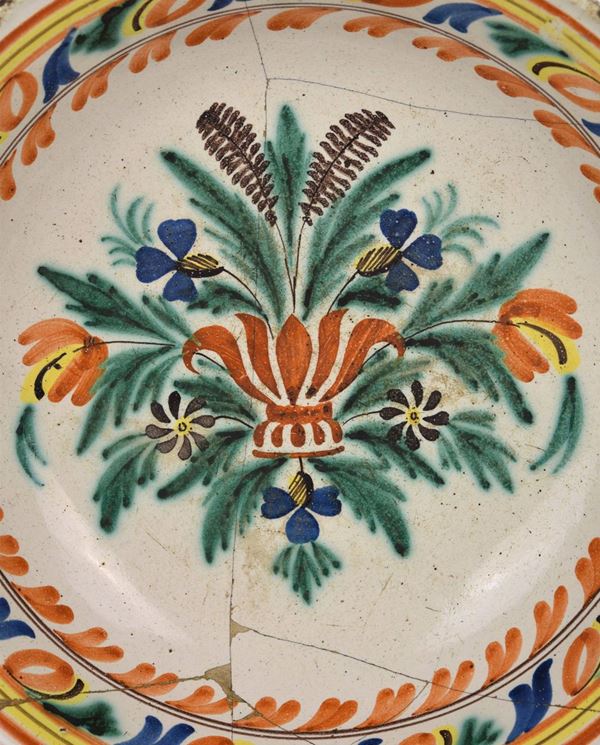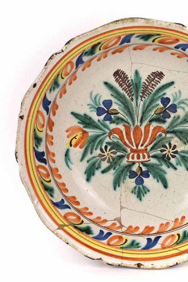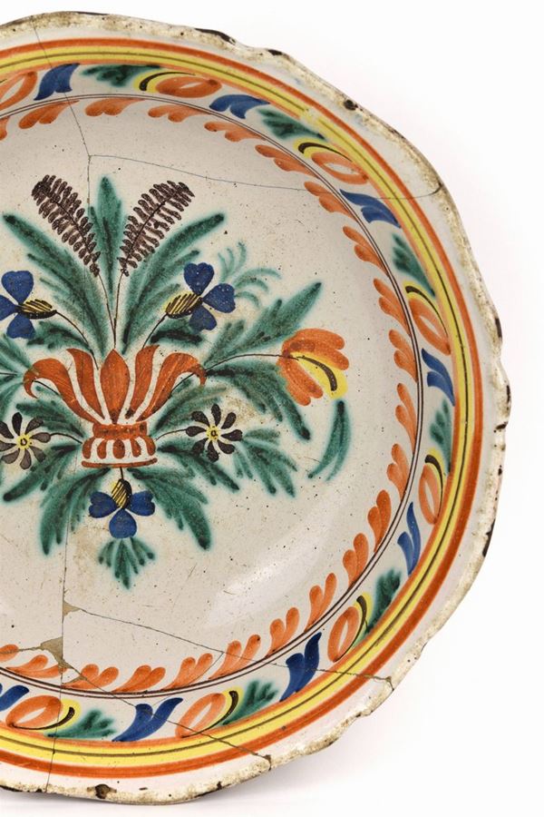 Catino in maiolica dipinta a colori vivaci con fiori al centro e motivi geometrici lungo il bordo.