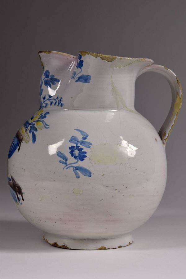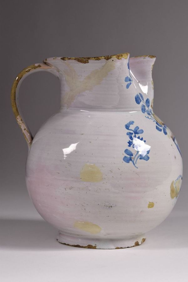 Grande brocca in maiolica policroma a bocca trilobata decorata con vaso con piedistallo e composizione floreale nei colori del blu, giallo e bruno.