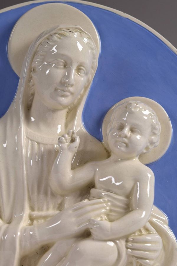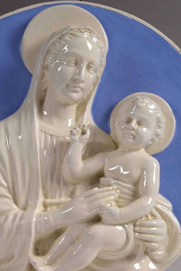 Ceramica toscana in stile robbiano a fondo azzurro, con Madonna e Gesù Bambino seduto e benedicente ad altorilievo a smalto bianco.