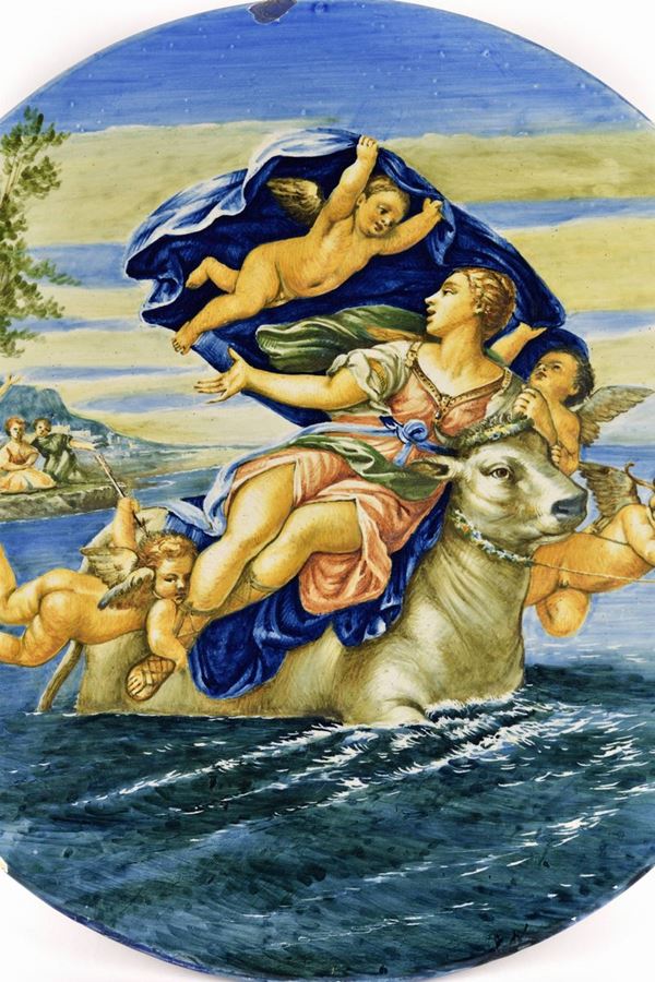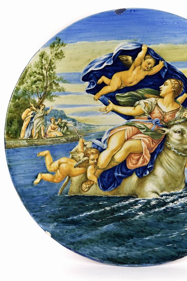 Grande piatto in maiolica policroma dipinta raffigurante il "Ratto d'Europa".