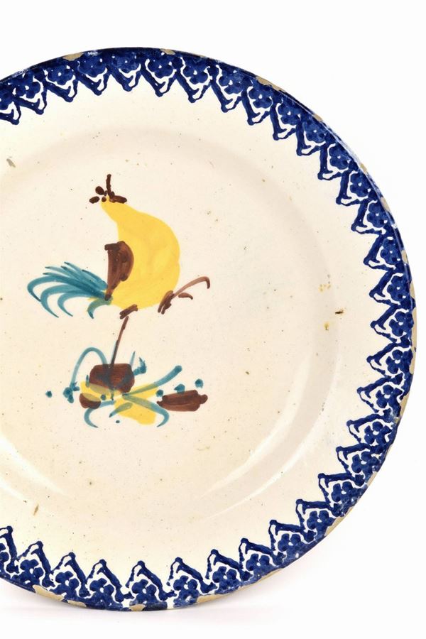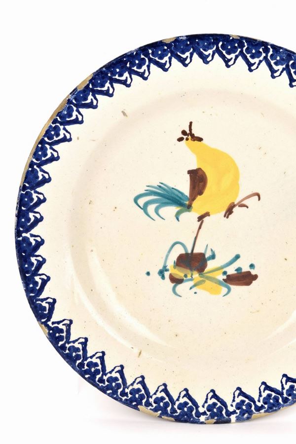 Piatto popolare in maiolica policroma con al centro dipinto un galletto e bordo decorato a stampino in blu.