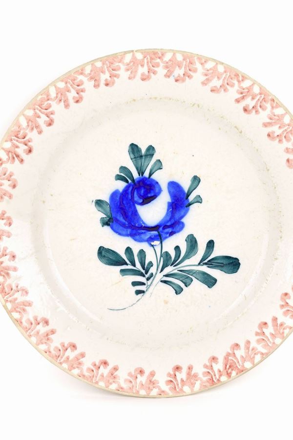 Piatto in maiolica policroma dipinta con rosa blu al centro e bordo decorato a stampino.