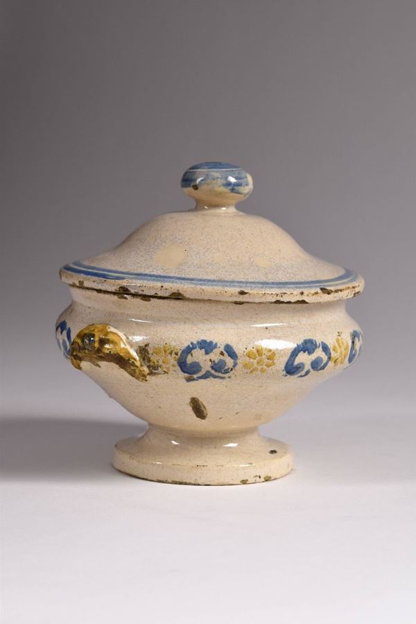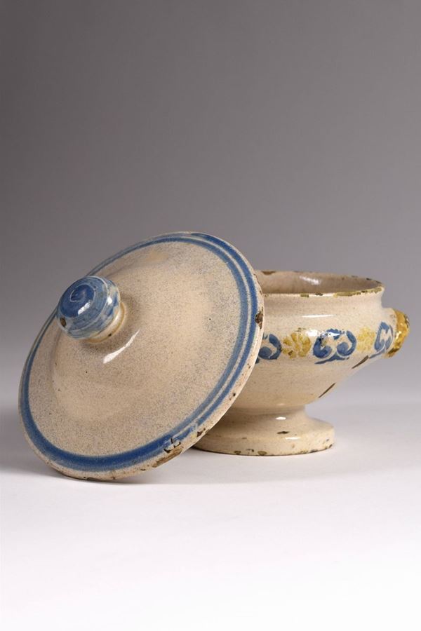 Piccola zuppiera in maiolica dipinta nel corpo a motivi a "spugna" azzurri e giallo ocra. Il bordo del coperchio è evidenziato da due righe azzurre, così come l'azzurro mette in evidenza il grande pomello. Manici ad altorilievo di color giallo ocra.
