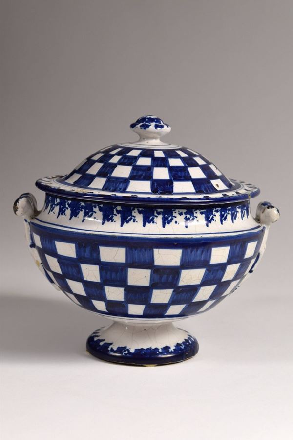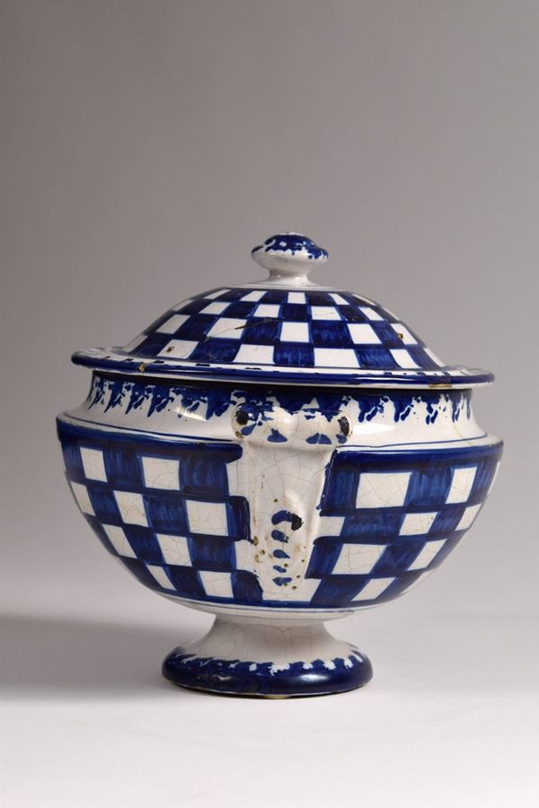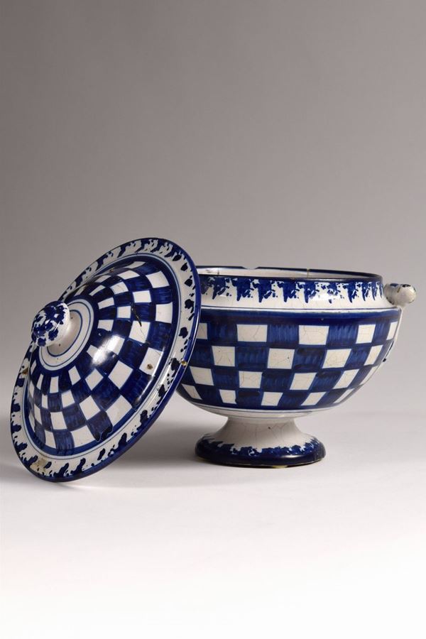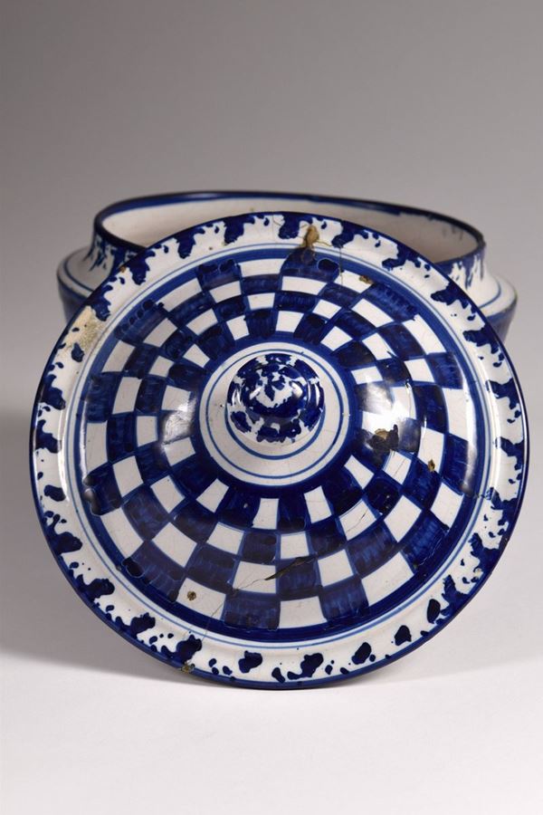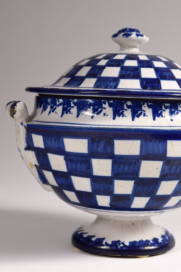 Particolare zuppiera in maiolica policroma dipinta a scacchi blu e motivi a "spugna" che evidenziano il pomello del coperchio, il bordo dello stesso, la bocca, manici e la base.
