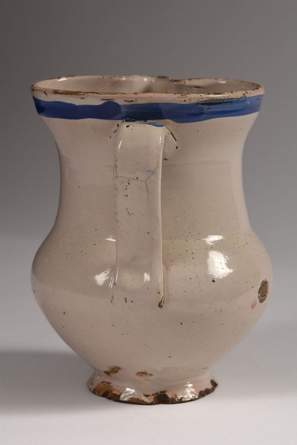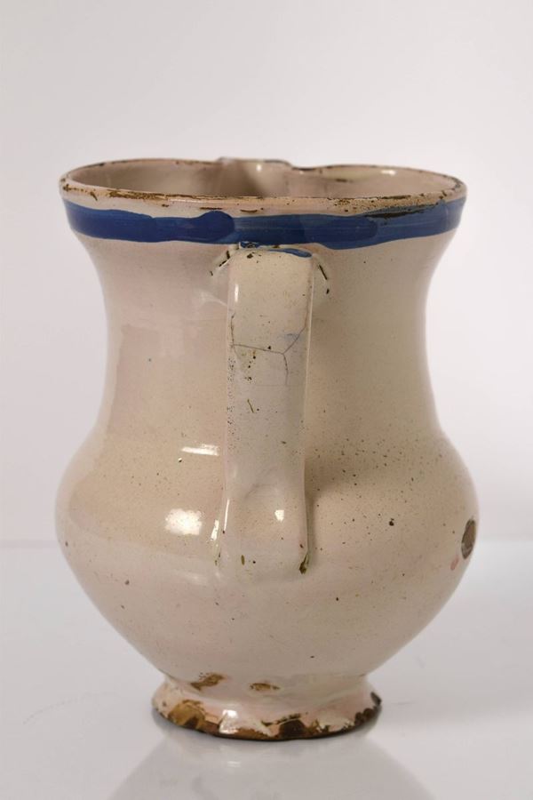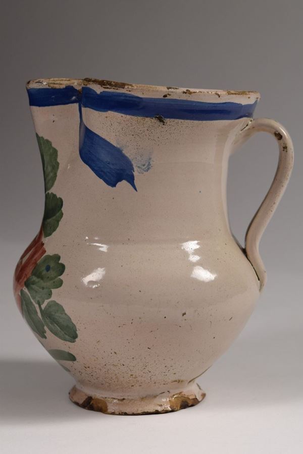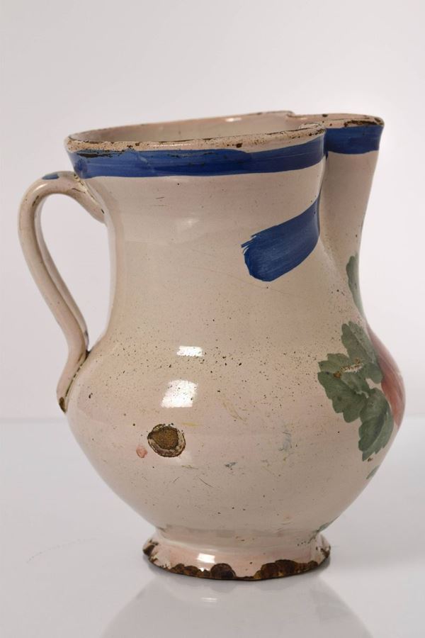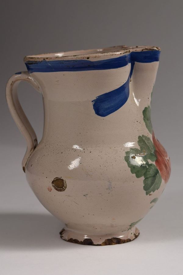 Boccale in maiolica policroma a bocca trilobata decorato alla rosa.