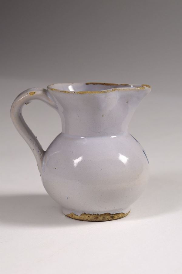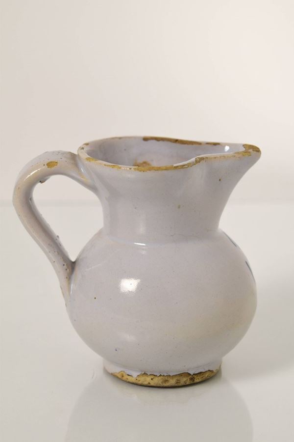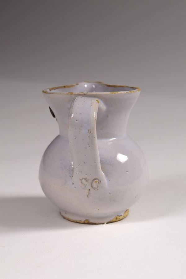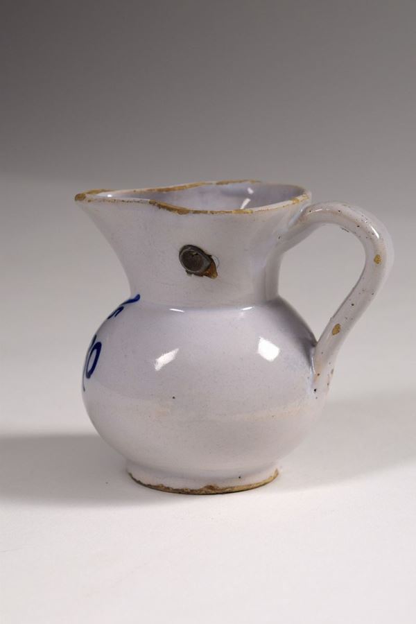 Boccale in maiolica bianca a bocca trilobata con scritta "1/5 litro" in blu, all'interno piombo annonario (bollo fiscale).