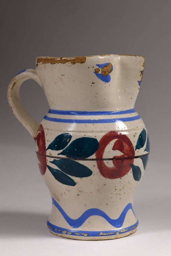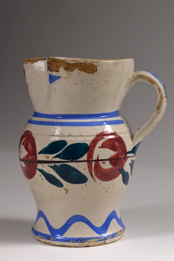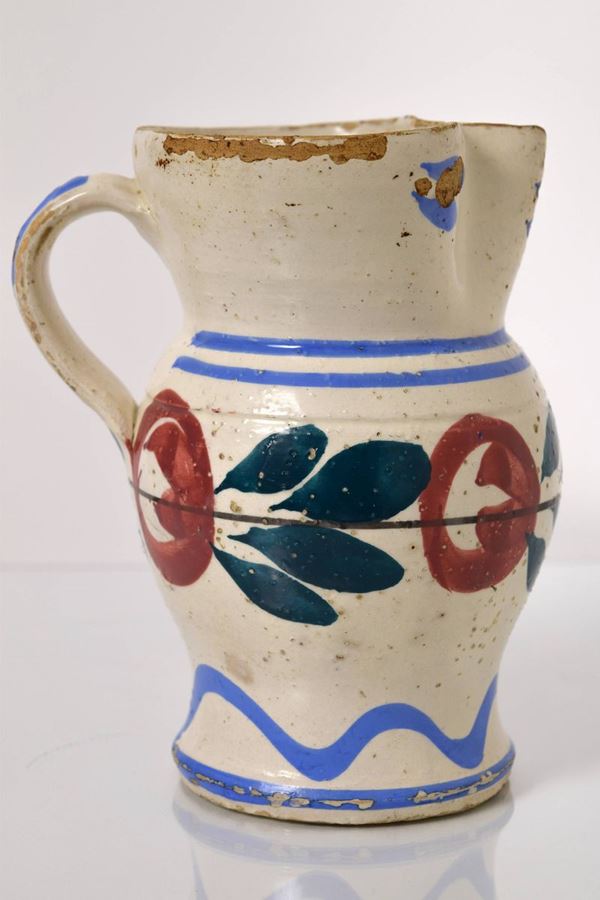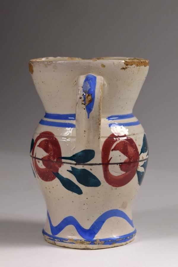 Boccale in maiolica policroma a bocca trilobata decorato con rose e decorazioni in azzurro.