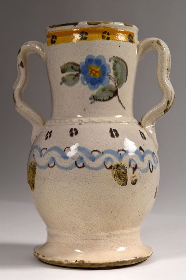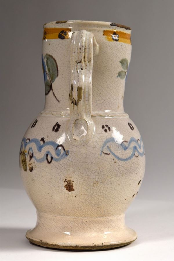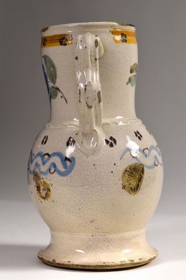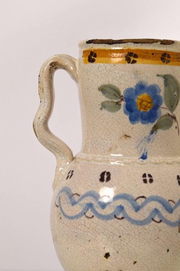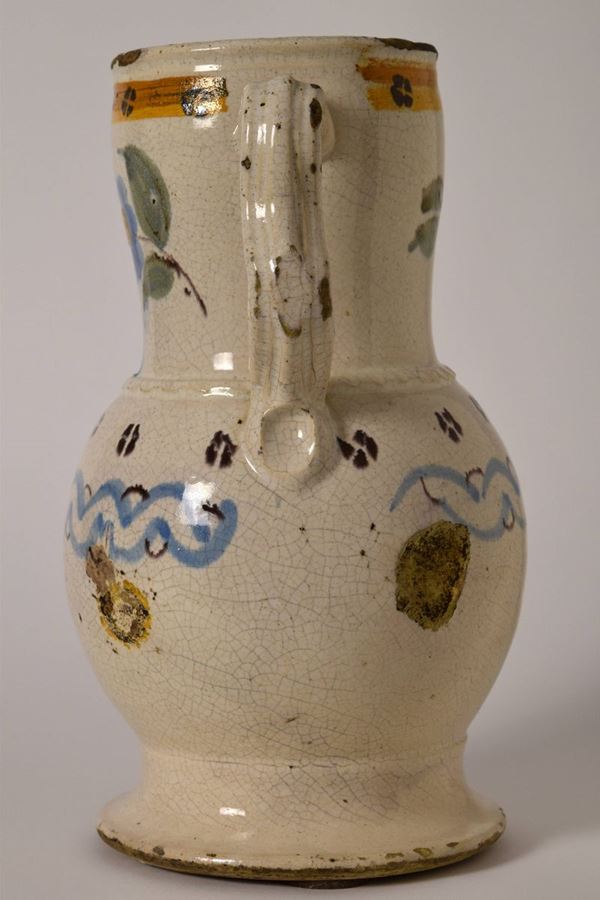 Brocca a due manici in maiolica policroma dipinta con motivi a "spugna" bruni evidenziati in giallo ocra nel bordo della bocca, nel fronte e nel retro è decorata con fiore azzurro e foglie verdi, nel corpo motivi a "spugna" in bruno e onde in azzurro.