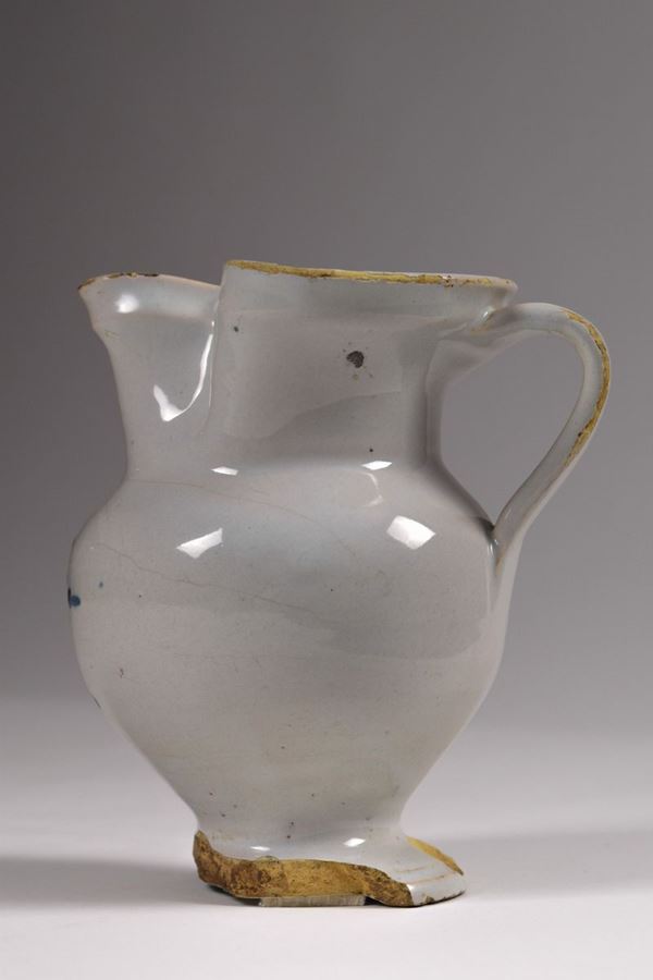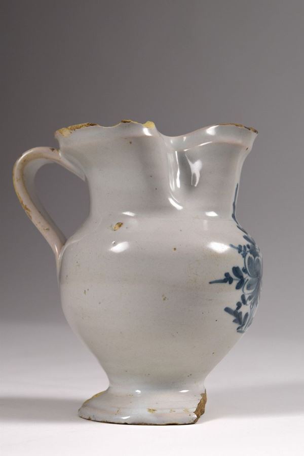 Brocca in maiolica smaltata a bocca trilobata con al centro motivo floreale monocromo.