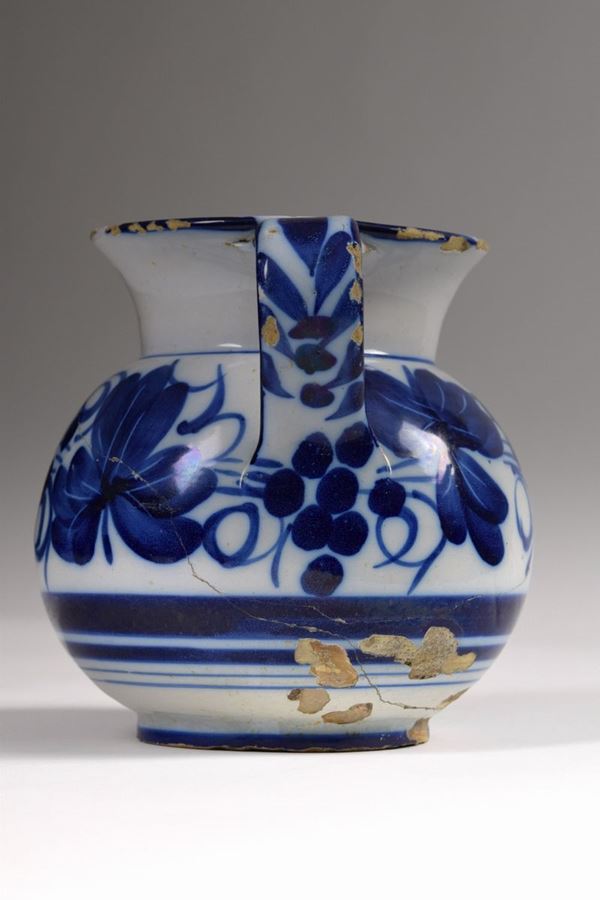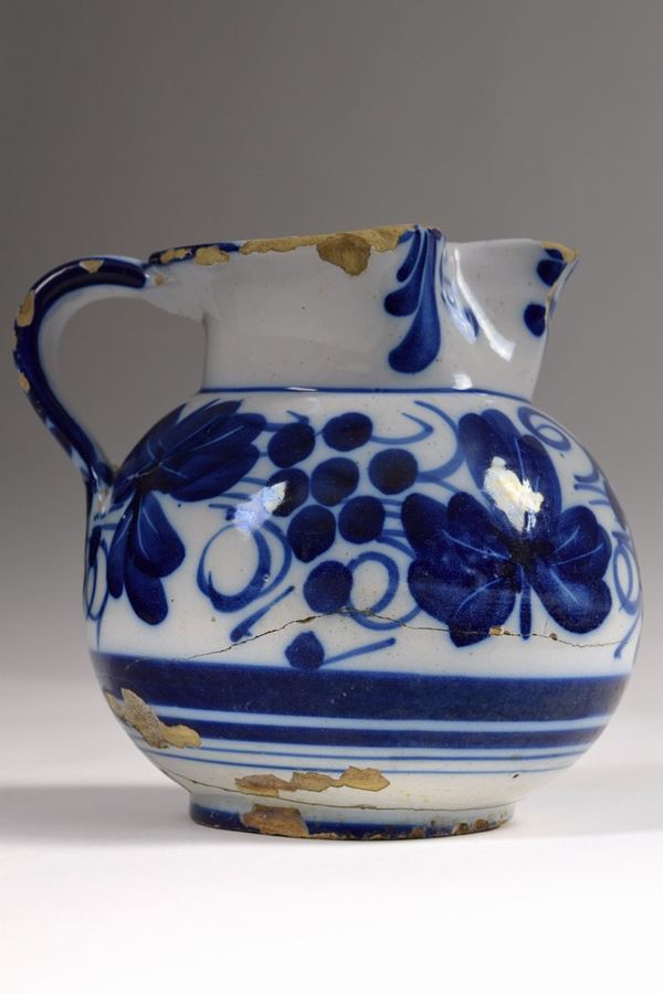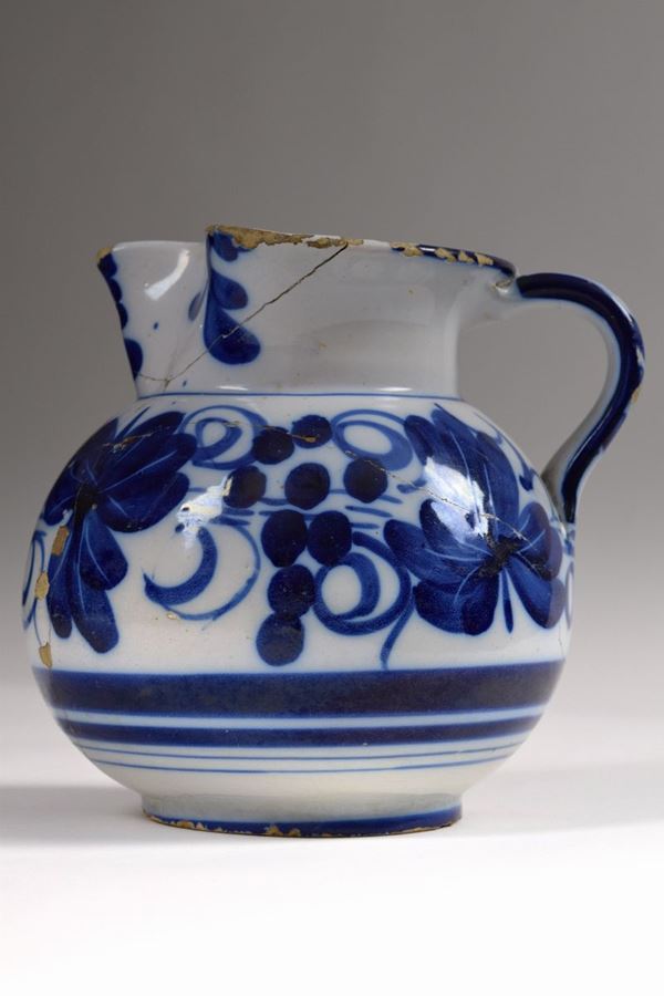 Brocca in maiolica dipinta con il blu Faenza con motivi vegetali. (difetti)