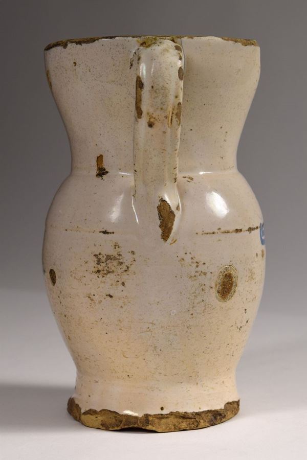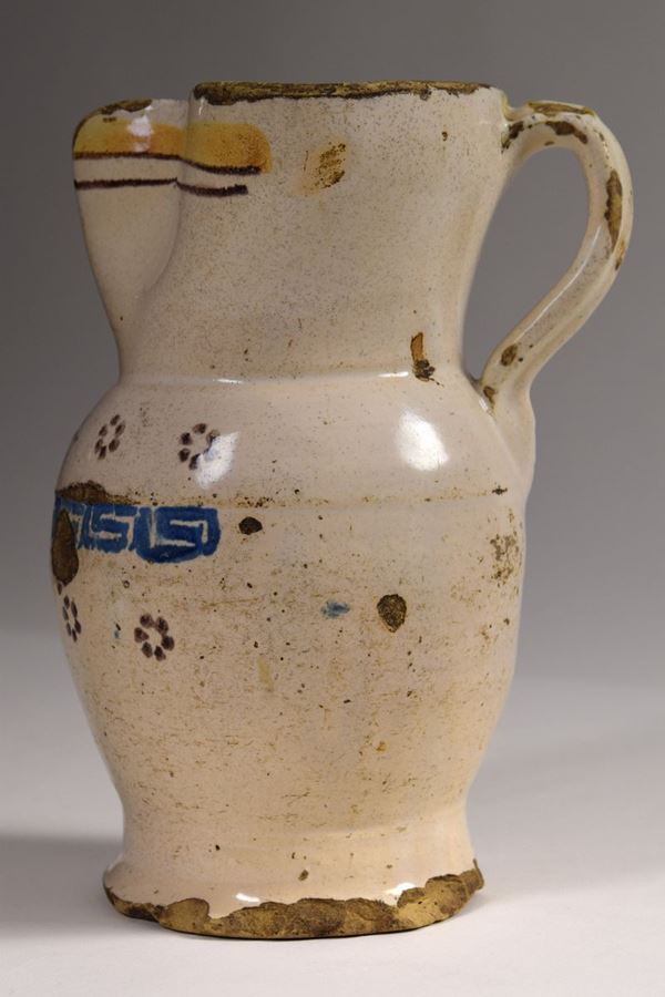 Brocca in maiolica policroma a bocca trilobata evidenziata a righe brune e giallo ocra, nella parte mediana decorazioni a "spugna" nei colori del bruno e azzurro.