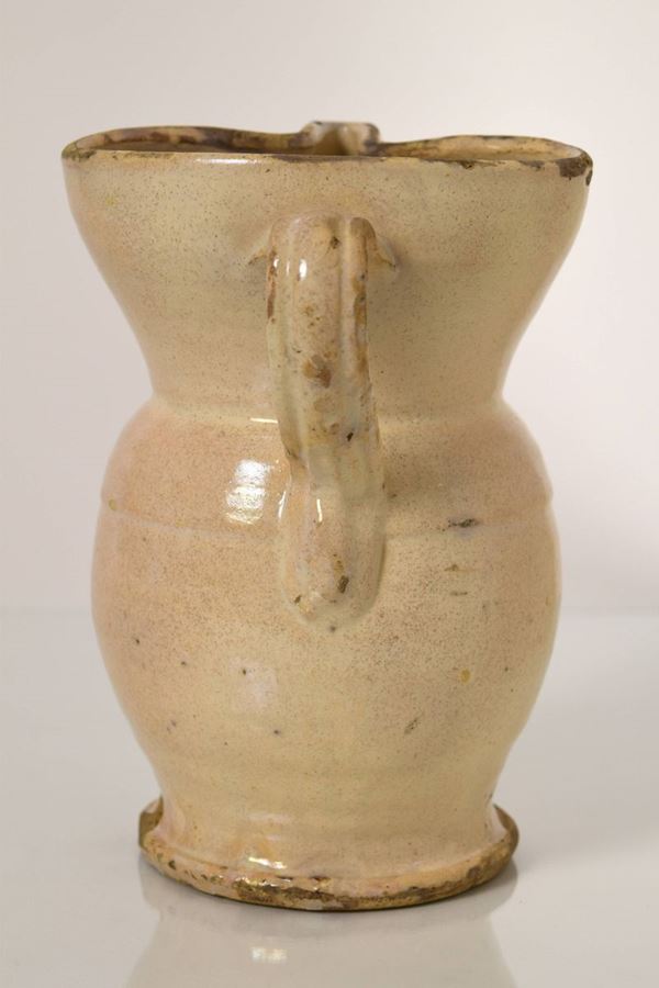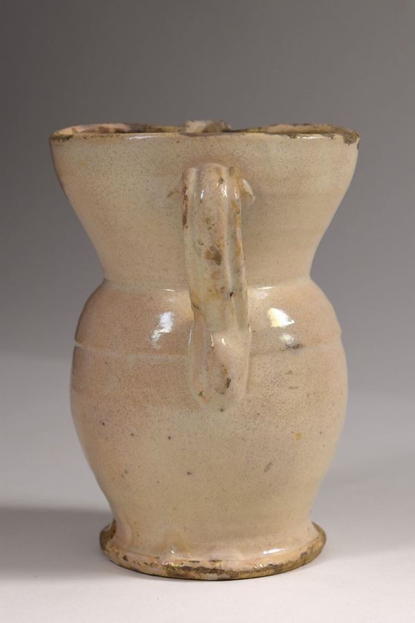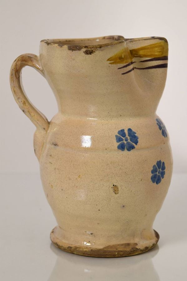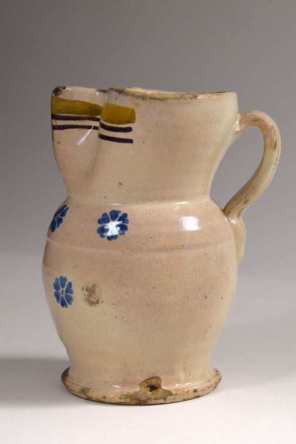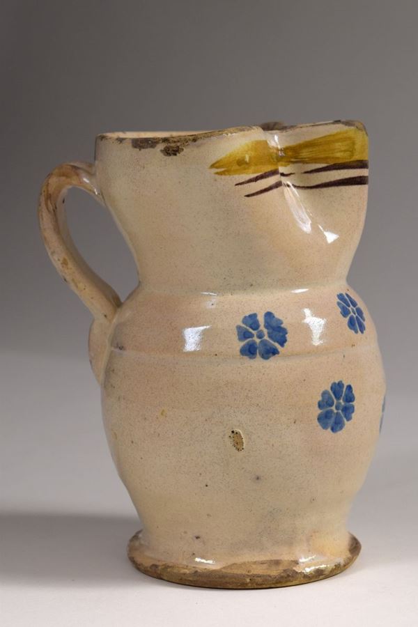 Brocca in maiolica policroma con bocca trilobata evidenziata da righe in bruno e ocra, corpo decorato da fiori a "spugna" in azzurro.