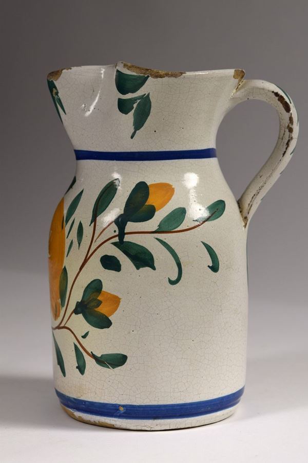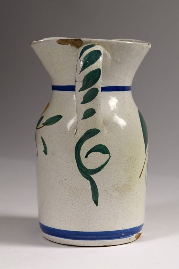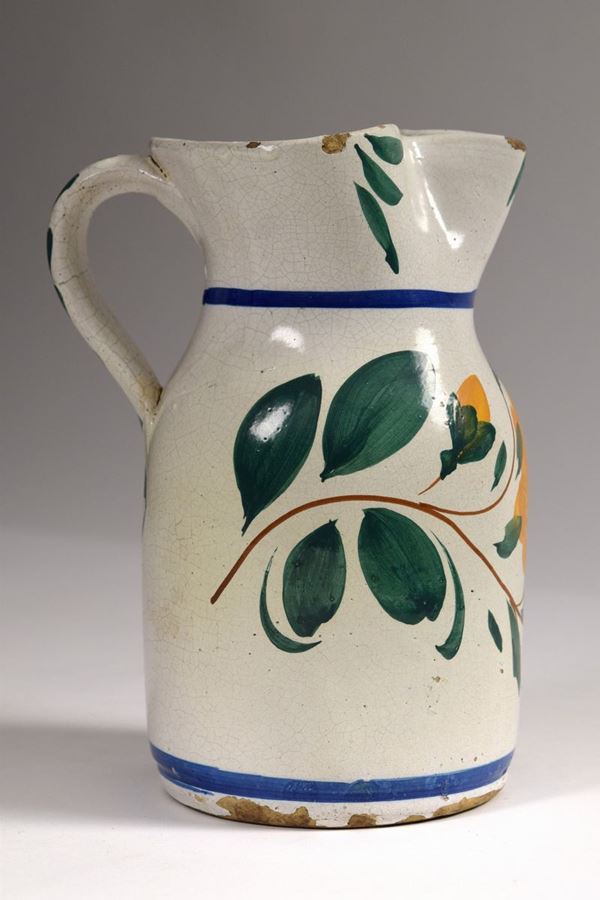 Brocca in maiolica dipinta a bocca trilobata evidenziata da foglie verdi, corpo decorato a fiori grandi arancioni e foglie.