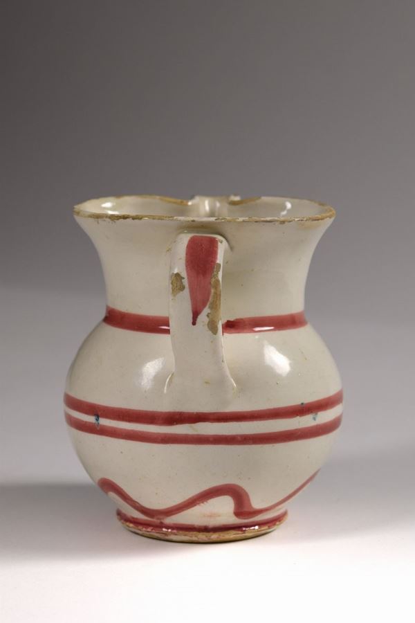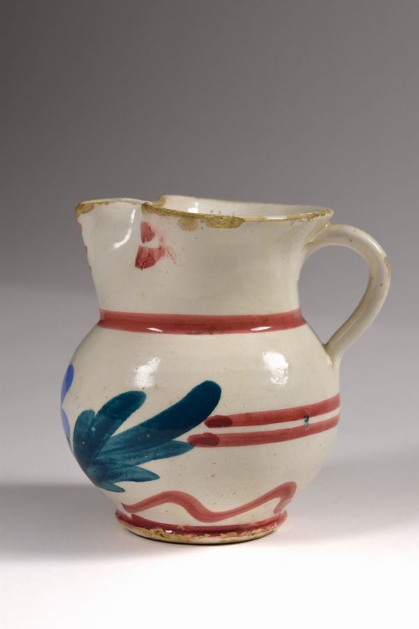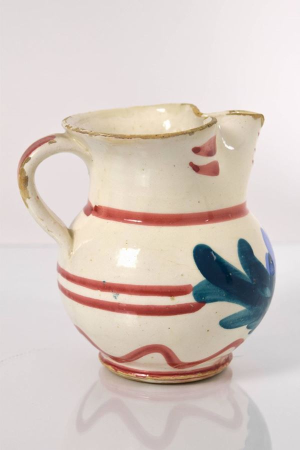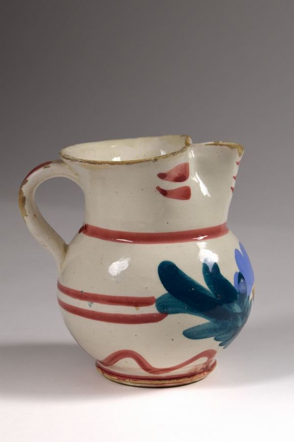 Brocca in maiolica policroma a bocca trilobata decorata alla rosa.