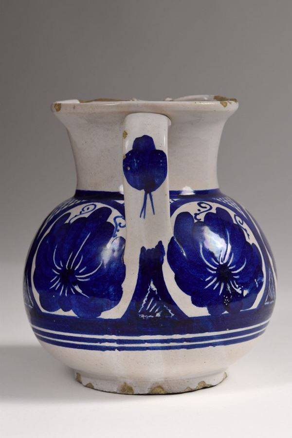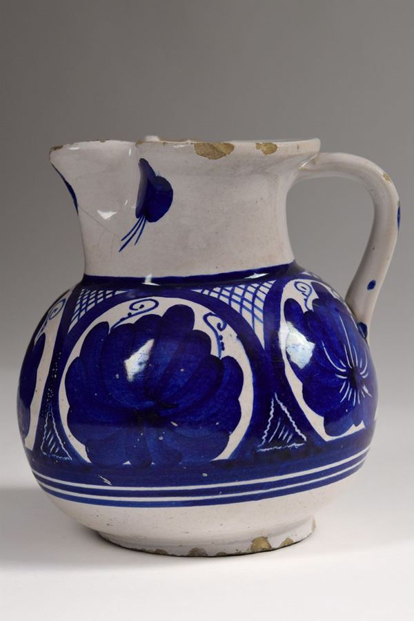 Brocca in maiolica dipinta a bocca trilobata evidenziata da tre fiori, corpo decorato a motivi floreali e reticci in blu.