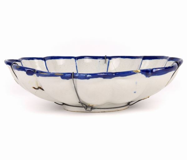 Centrotavola bacellata in maiolica dipinta in blu.