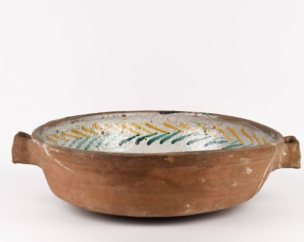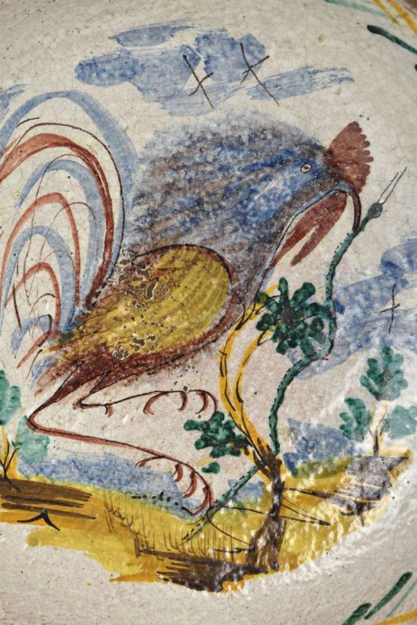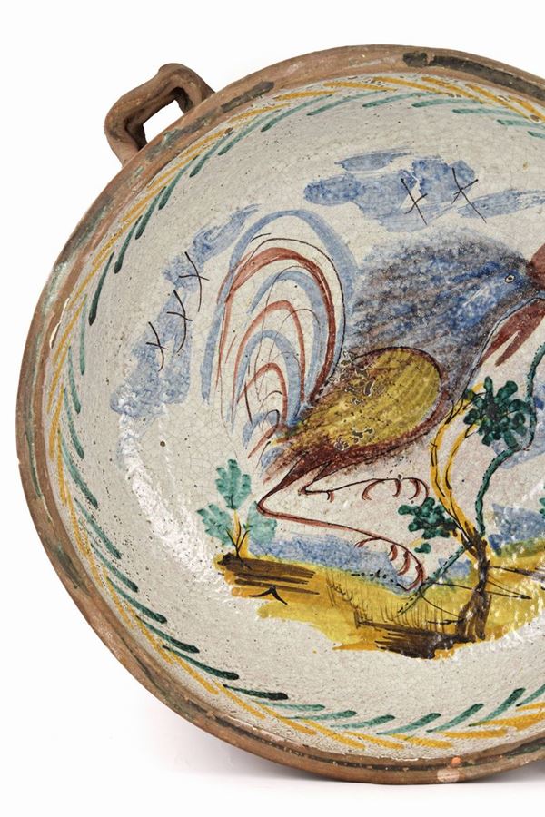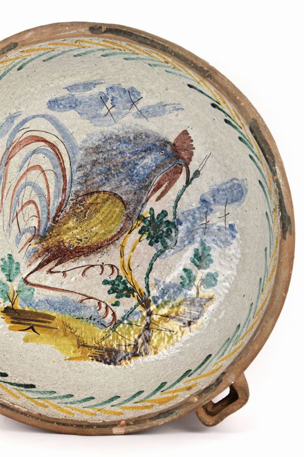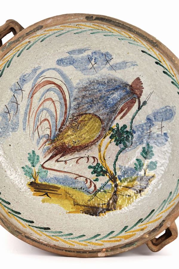 Grande catino a due manici in terracotta smaltata con al centro un gallo. Bordo evidenziato da motivi geometri nei colori del verde e del giallo.