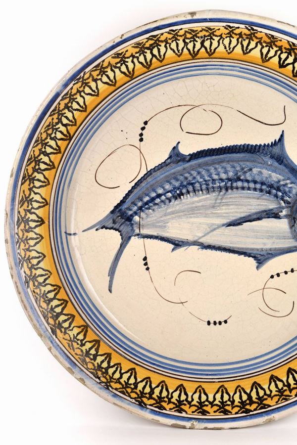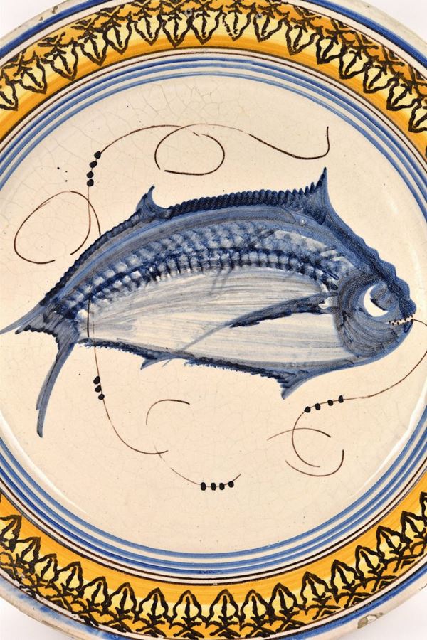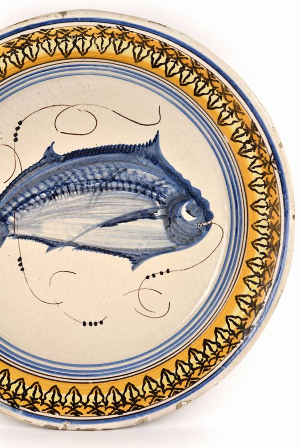Grande piatto in maiolica policroma dipinta con grande pesce al centro, tesa decorata a motivi geometrici bruni a fondo giallo ocra.