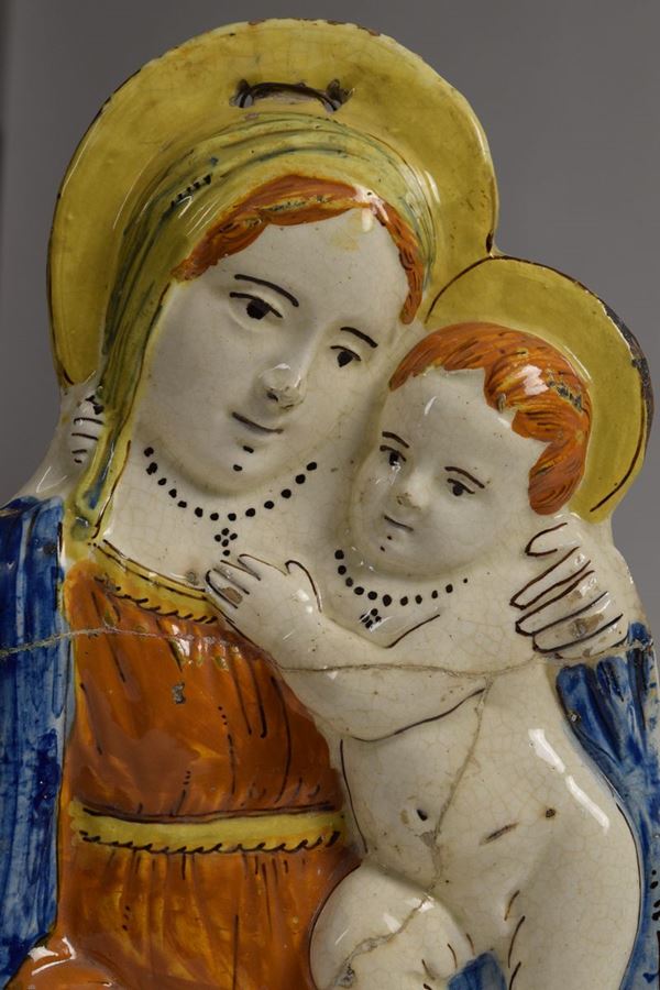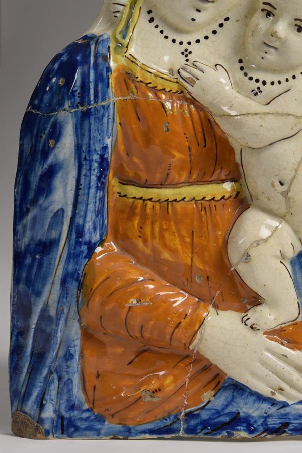 Targa devozionale in ceramica policroma plasticata da stampo, di Madonna con Bambino in piedi nella classica iconografia romagnola. Nei colori del blu, giallo e arancio. Restauri.