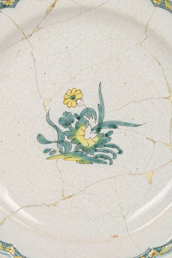Piatto in maiolica a gran fuoco nei toni del verde e del giallo, composizione floreale al centro.