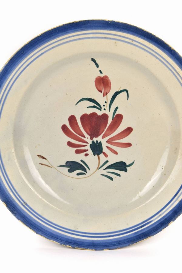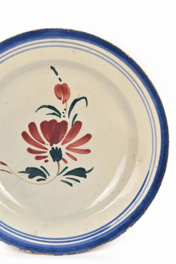 Piatto in maiolica policroma dipinto con fiore rosso al centro e tesa decorata a righe blu.