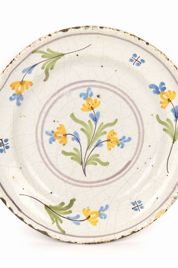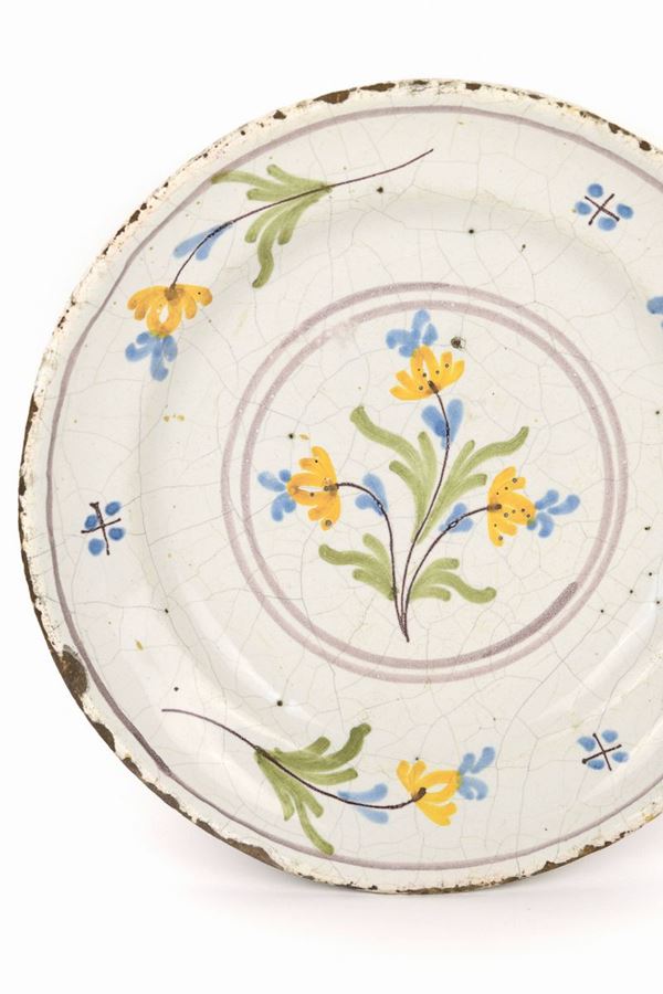 Piatto in maiolica policroma dipinto a motivi floreali e vegetali.