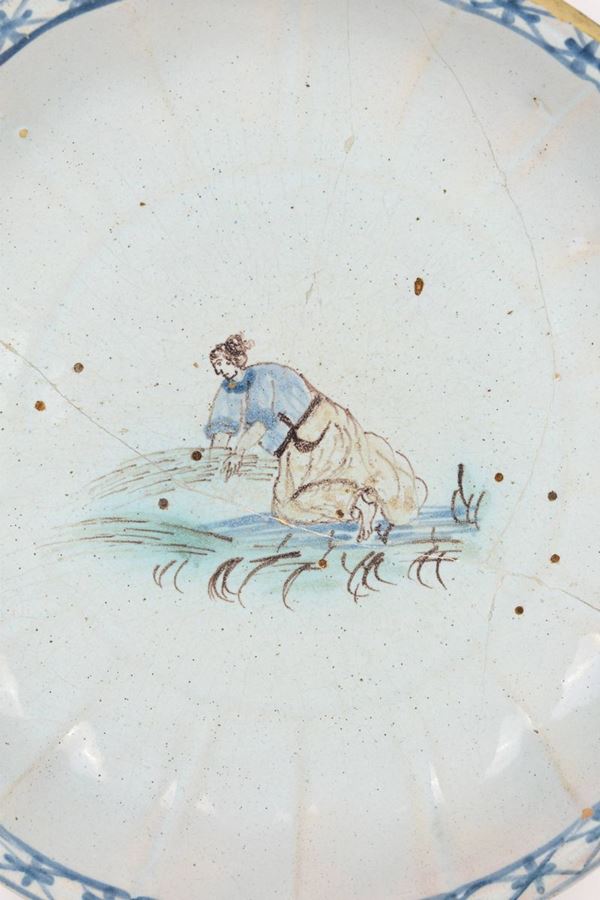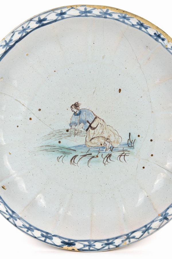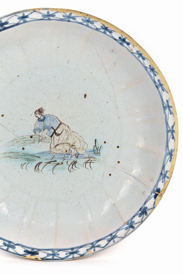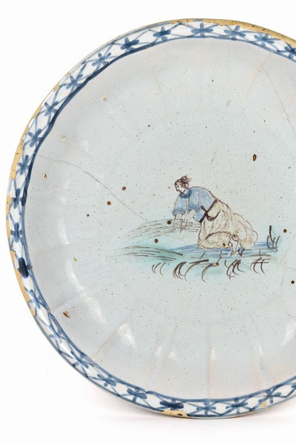 Piatto in maiolica policroma dipinto con donna al lavoro al centro, bordo a motivi geometrici blu.